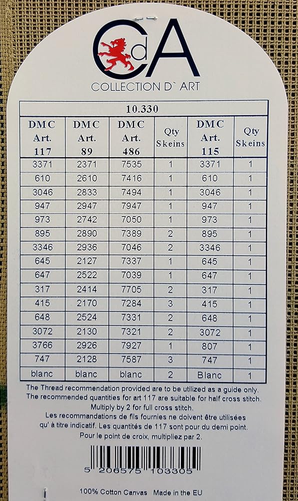 The colors guide chart for DMC Embroidery Floss is printed on the sides of canvas.