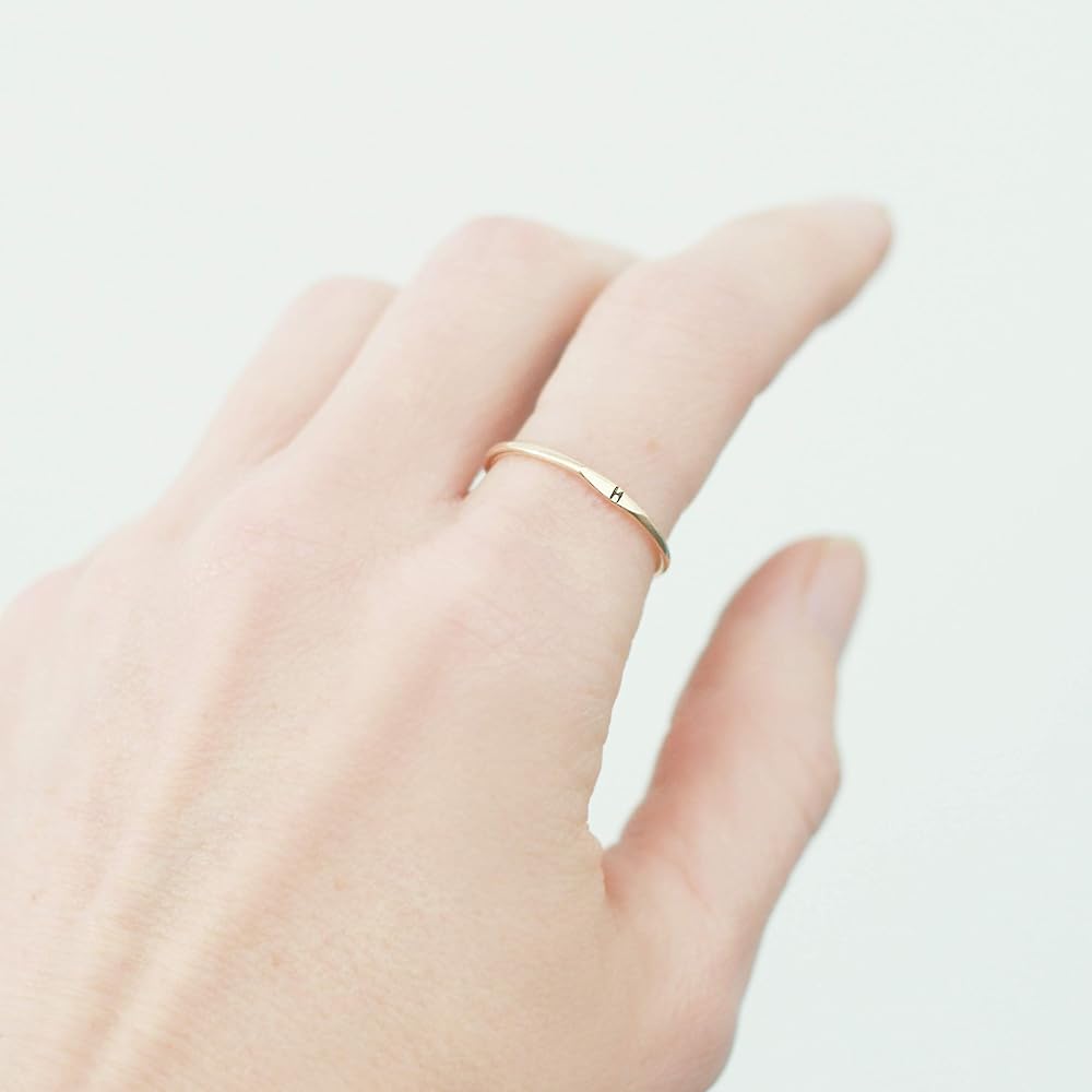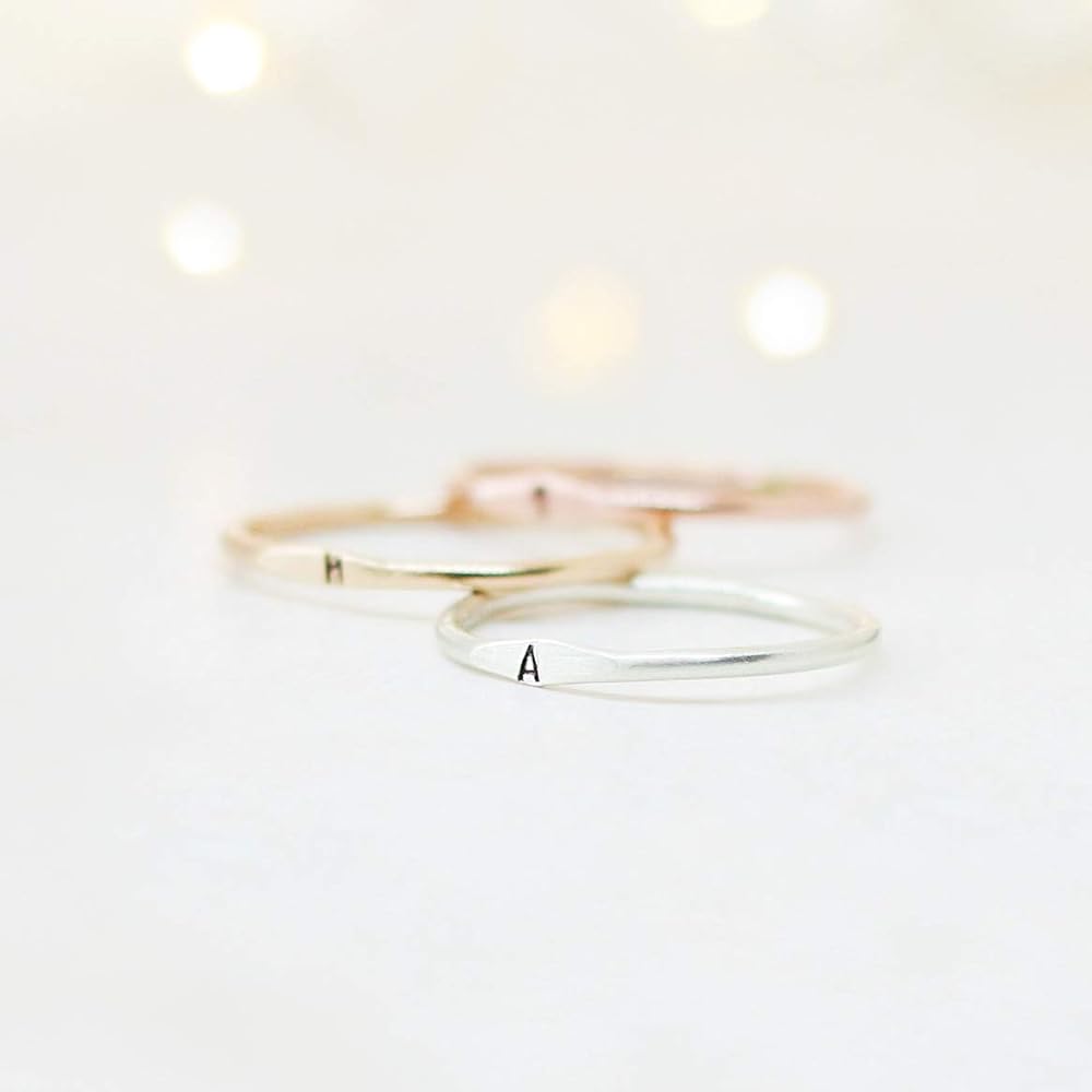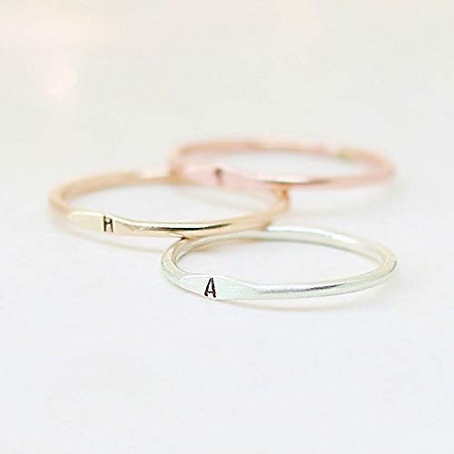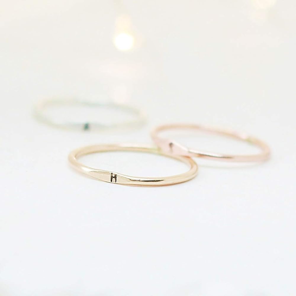 A little secret of a letter. Our slim 1.3 mm band is hand formed, soldered, hammered and stamped with your tiny initial in sterling silver, gold or rose fill. Wear one, or stack them for all your loves. ♥ Listing is for one ring. Choose multiples with the drop-down menu.