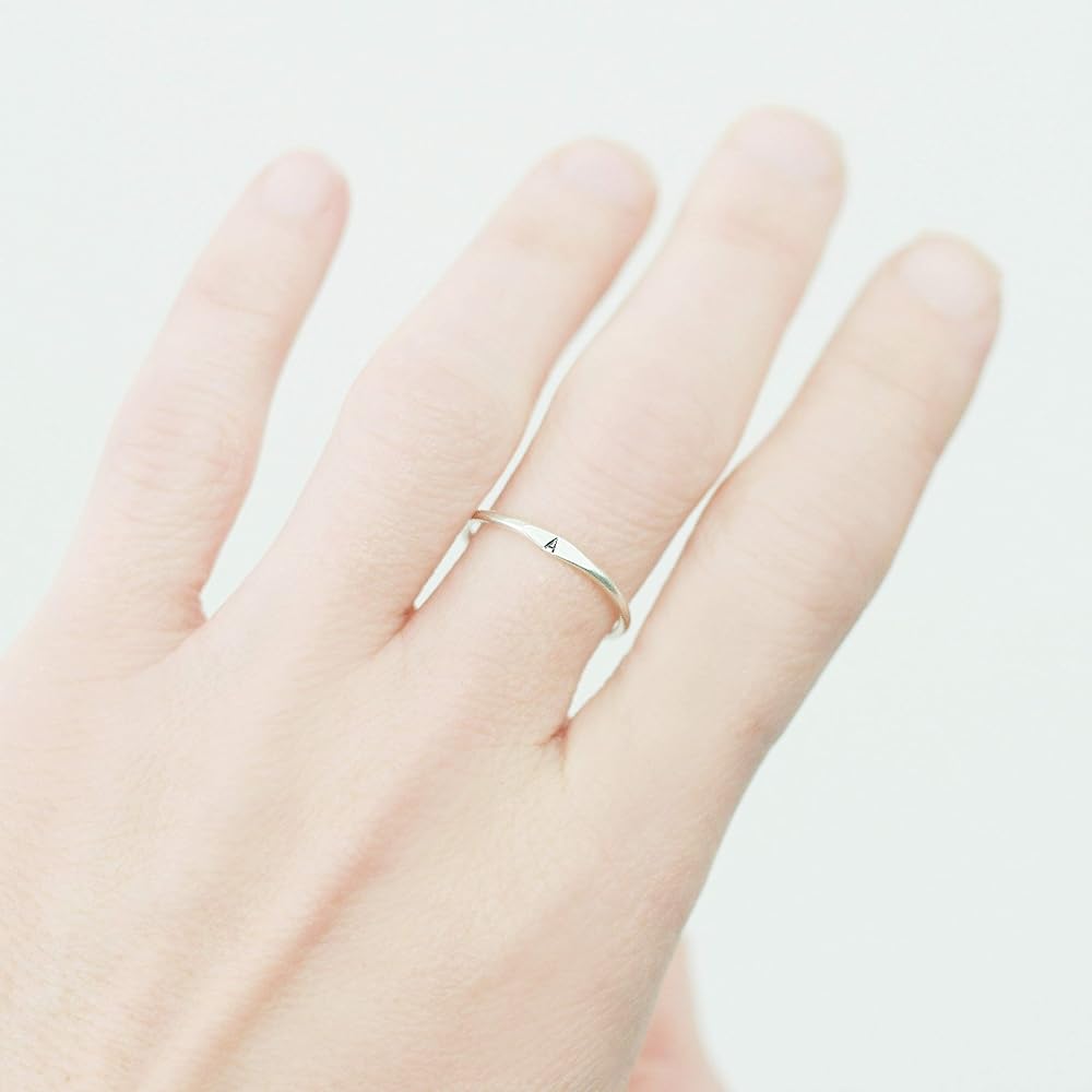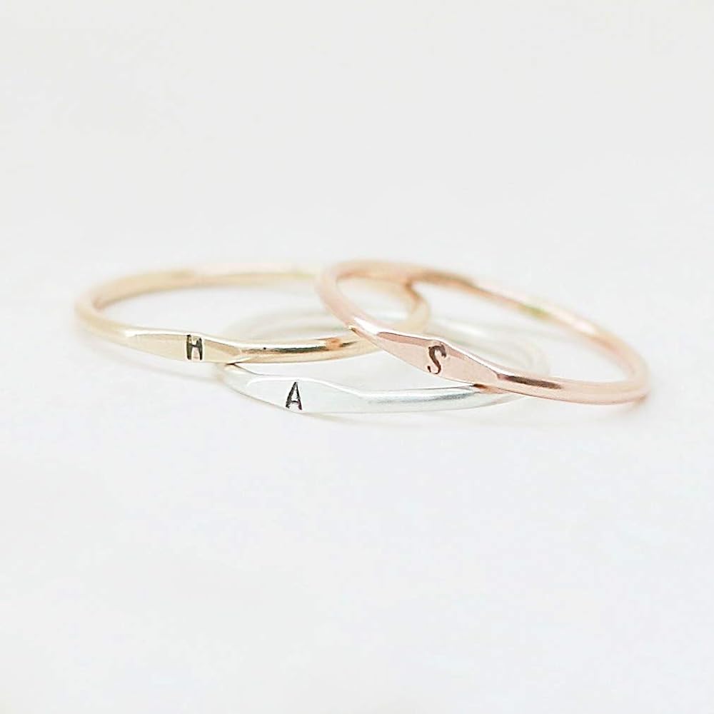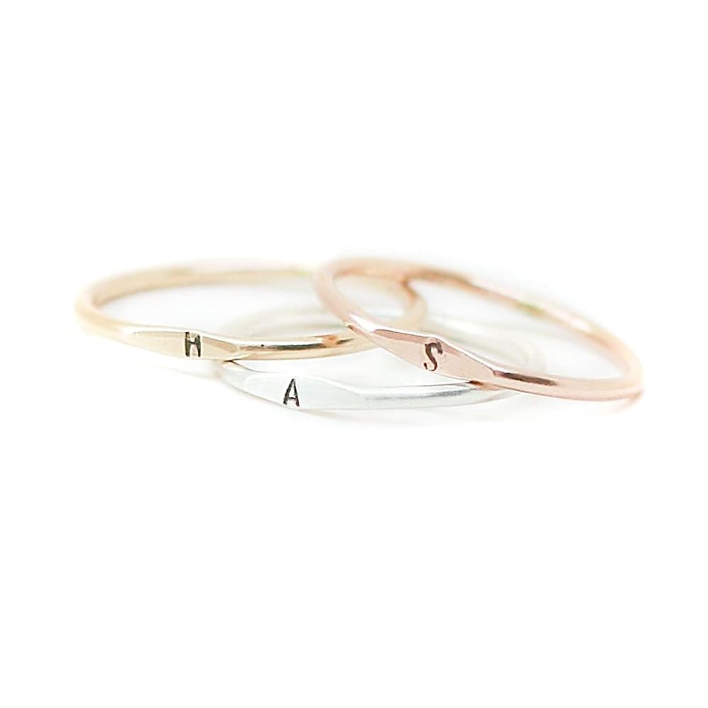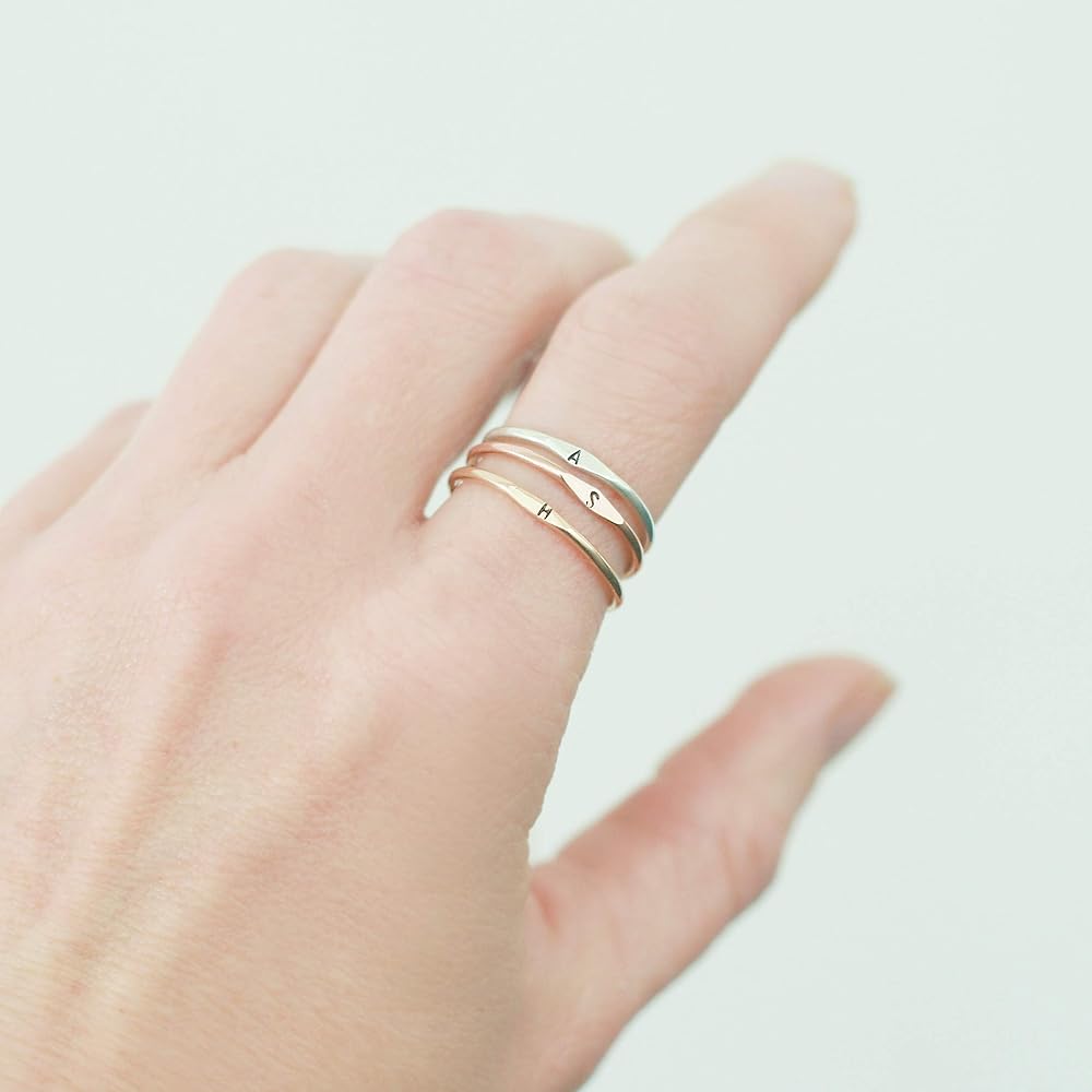 A little secret of a letter. Our slim 1.3 mm band is hand formed, soldered, hammered and stamped with your tiny initial in sterling silver, gold or rose fill. Wear one, or stack them for all your loves. ♥ Listing is for one ring. Choose multiples with the drop-down menu.