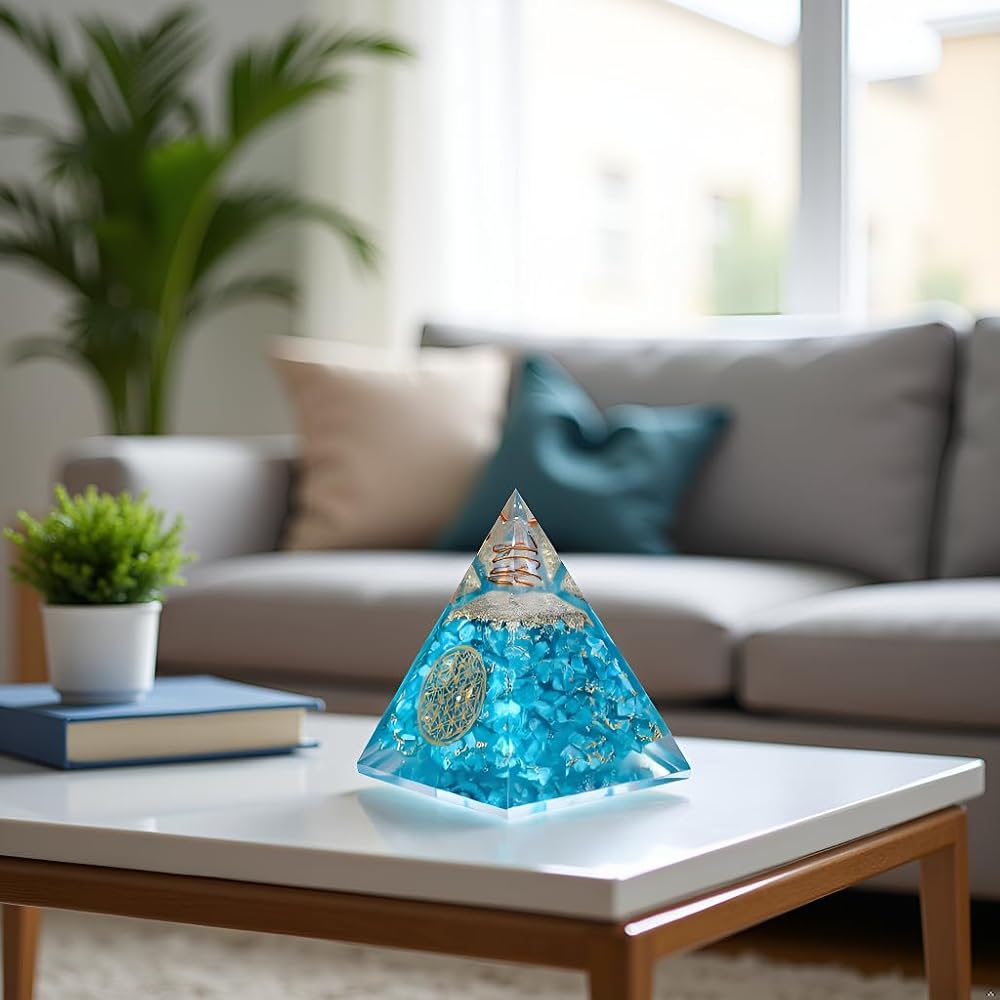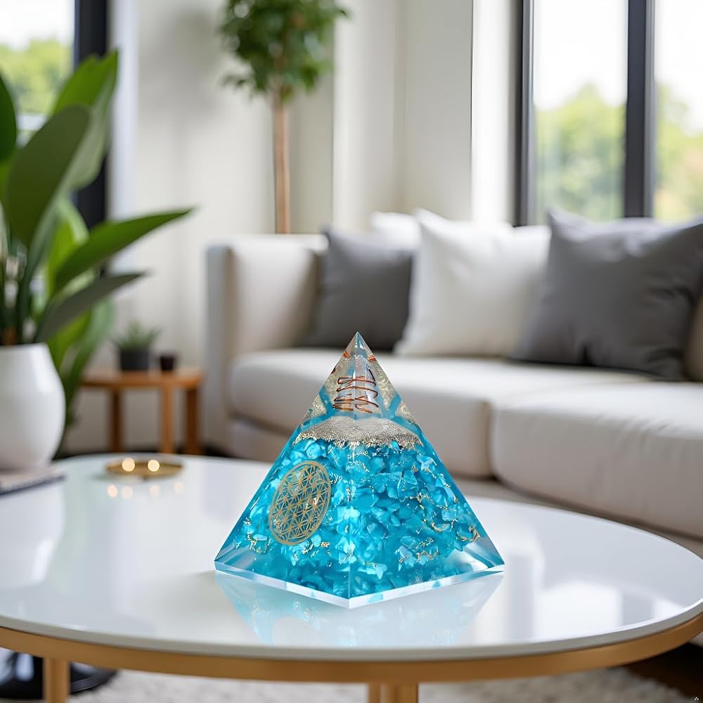Experience deep serenity and emotional clarity with our Handmade Aquamarine Orgonite Pyramid, a powerful healing crystal energy tool infused with intention and handcrafted by talented women artisans. Aquamarine, known as the stone of tranquility, is celebrated for calming the mind, reducing stress, and supporting clear communication. Each pyramid is carefully layered with natural Aquamarine chips, resin, and copper spirals to amplify its orgone energy output. Whether you're looking to balance your throat chakra, elevate your meditation practice, or simply add peaceful energy to your home or workspace, this pyramid is a beautiful and functional choice. Place it in your bedroom, on your desk, or in your sacred altar space to enjoy a continuous flow of positive vibrations and EMF protection. This orgonite pyramid also makes a meaningful, eco-conscious gift for loved ones seeking emotional wellness, spiritual grounding, or a touch of mindful decor.