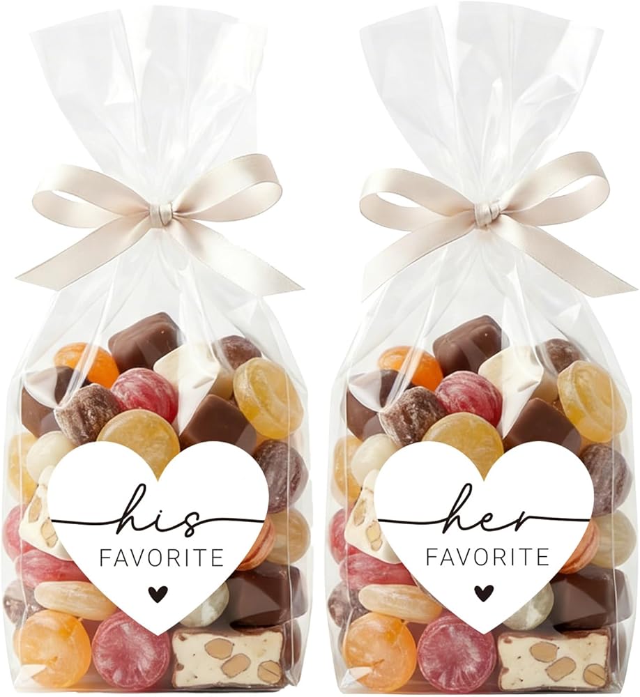 Make your wedding celebration or bridal shower even more unforgettable with the xcanartvy His and Her Favorite Stickers and Bags Set. This charming set includes 60 Elegant Heart-Shaped Stickers (30 “His Favorite” and 30 “Her Favorite”) and 60 self-sealing clear treat bags, making it easy to package snacks, candies, or small gifts for your guests. The labels feature a stylish design that complements any wedding theme, from rustic to modern. Whether you're creating welcome bags, dessert table treats, or take-home favors, this all-in-one set adds a thoughtful, personalized touch to every detail of your event.