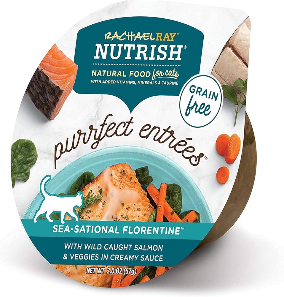 Rachael Ray Nutrish Purrfect Entrees wet cat food variety pack includes delicious recipes made with simple, natural ingredients, like real tuna and wholesome veggies with added vitamins, minerals and taurine. These mouth-watering entrees deliver the taste cats crave with tender cuts of tuna, chicken or salmon and real veggie pieces in a savory sauce. Your cat is sure to love the gourmet flavor combinations of each variety of Rachael Ray Nutrish Purrfect Entrees.