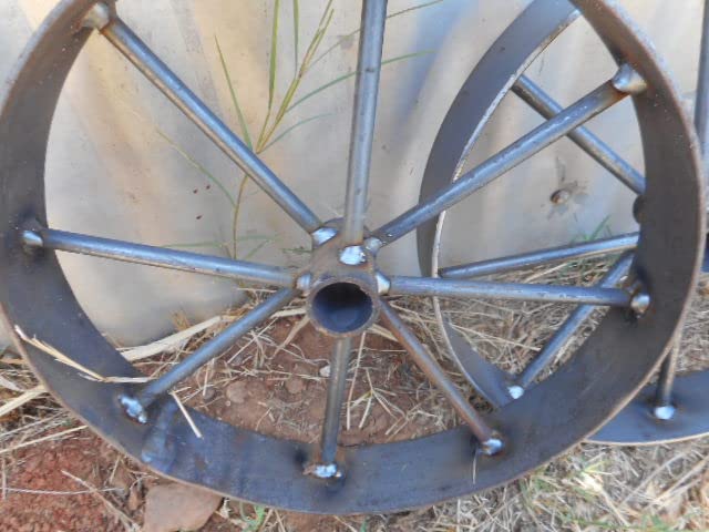 A pair (2) of welded steel wagon wheels . mostly for Decorative use, but Suitable for Carts BQ pits, etc. as they are made of solid bar and plate heavier and longer lasting than any others sold on Amazon. The rim is 2" wide, the Hub length is 2 3/8 long , hub Inside diameter in 1". The roundness is within 1/2" to 1/4" and not recommended for animal or Human transport.