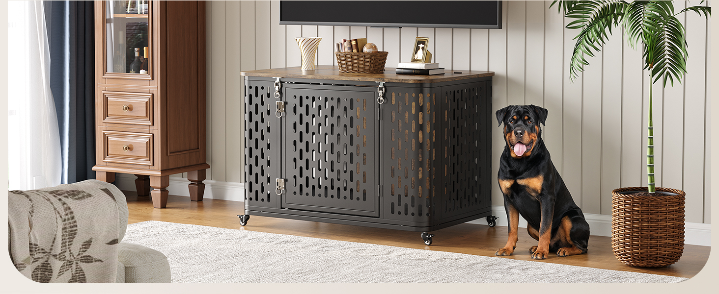 أثاث قفص الكلاب مع وسادة وعجلات: يوفر أثاث بيت الكلاب وسادة مائية مريحة للنظافة. و 4 عجلات قابلة للدوار تسمح لك بالتحرك وقفل قفص الكلب في أي مكان تريده ، يمكن أن يسمح تصميم إطار الحديد الزاوية الفريد من نوعه للكلاب ليس من السهل عض قفص