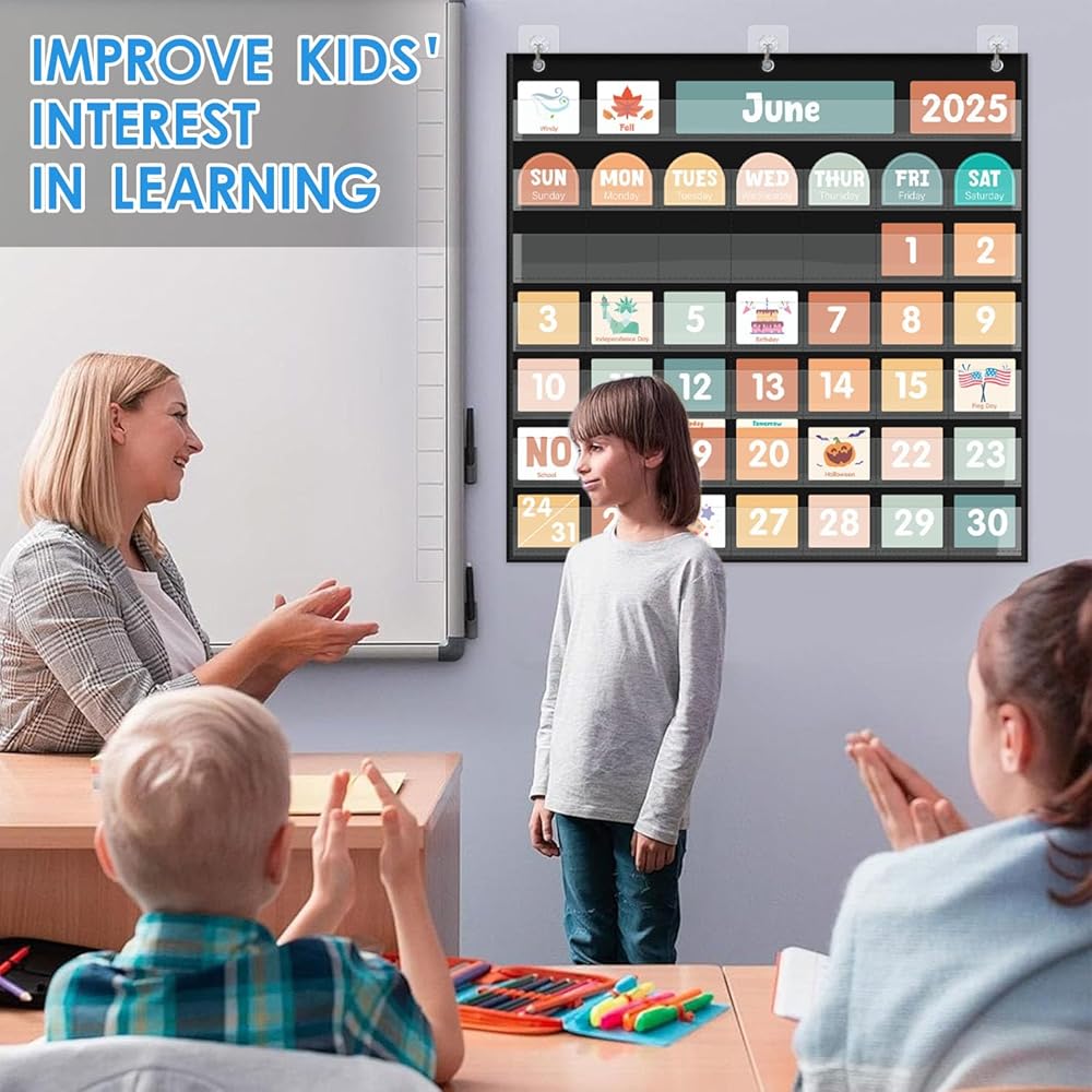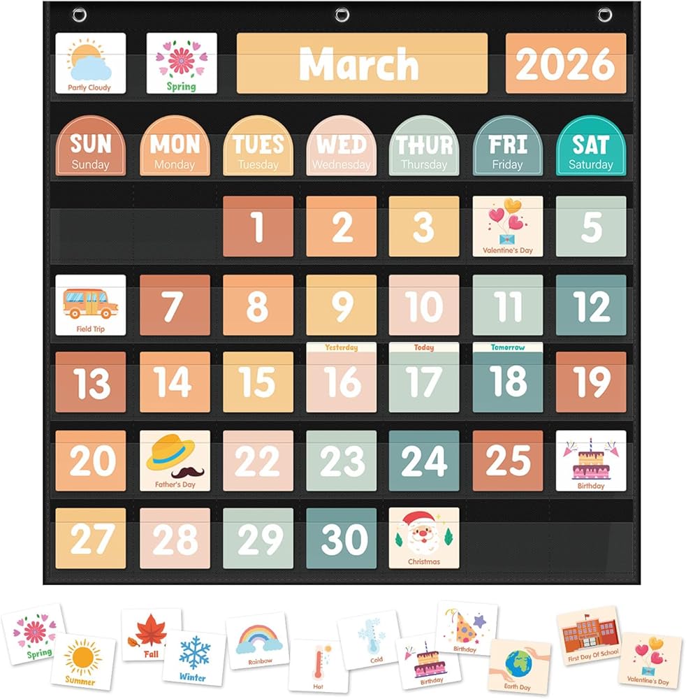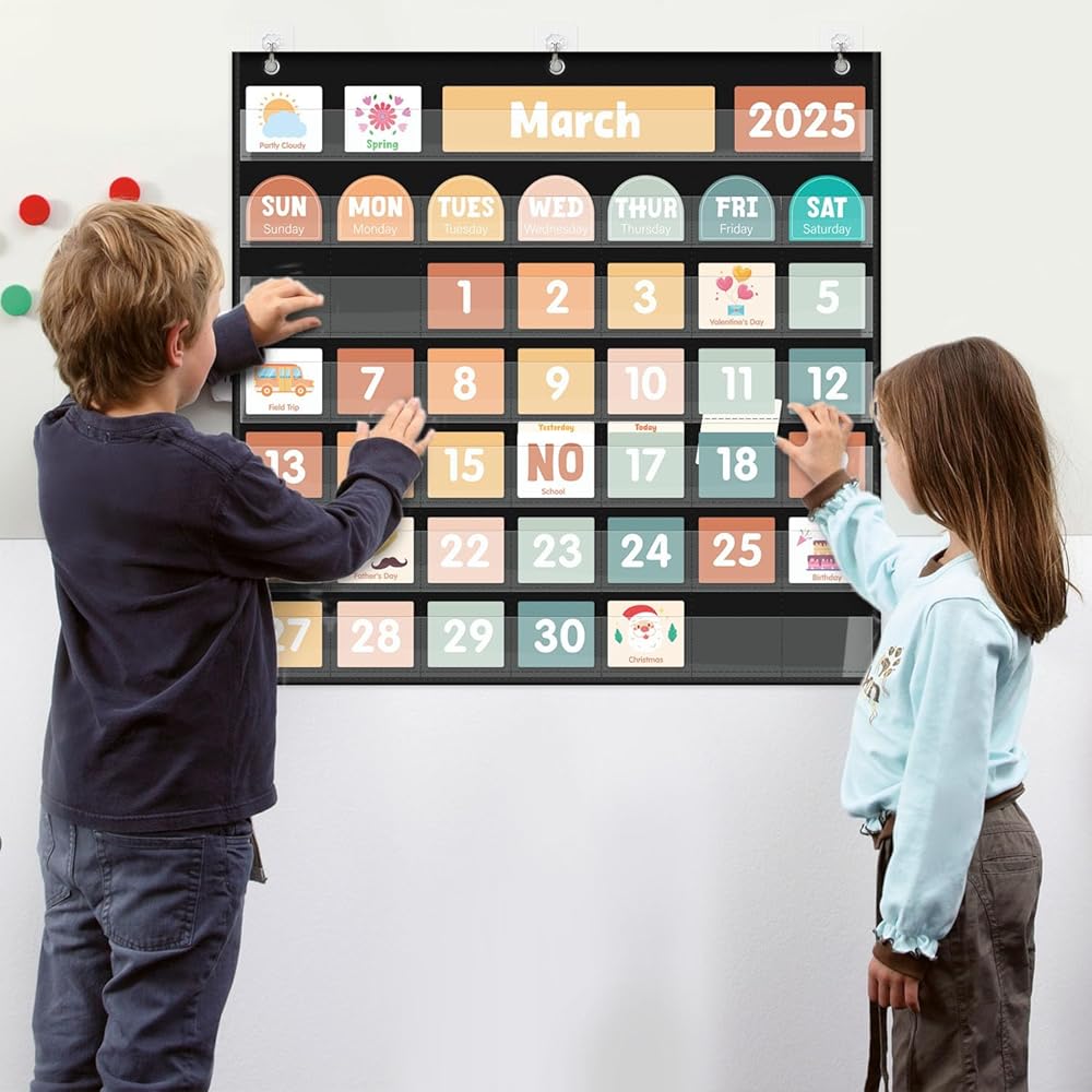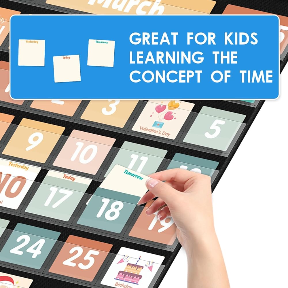 【مصمم خصيصًا للأطفال - مصمم مع الأطفال في الاعتبار ، هذه المجموعة ملونة بألوان زاهية ، وبسيطة للغاية لمتابعتها مثالية للأطفال الصغار. من خلال مخطط جيب التقويم هذا ، يمكن للأطفال التعرف على التواريخ والأسابيع والشهور والسنوات والمواسم والعطلات وبعض الأنشطة