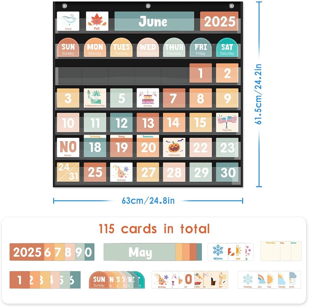 【ستحصل على】 1piece من مخطط جيب التقويم الكبير ، و 115 PCS بطاقات في المجموع (بما في ذلك 4 بطاقات فارغة ، و 6 بطاقات أعياد الميلاد ، و 3 بطاقات تاريخ خاصة (أمس ، اليوم ، غدًا) ، 3 بطاقات فئة ، 3 بطاقات نزهة ، 12 بطاقة الطقس ، 22 بطاقة عطلة ، 4 بطاقات موسمية ، 33 بطاقات تاريخ ، 7 أسابيع ، بطاقات 12 شهرًا.)