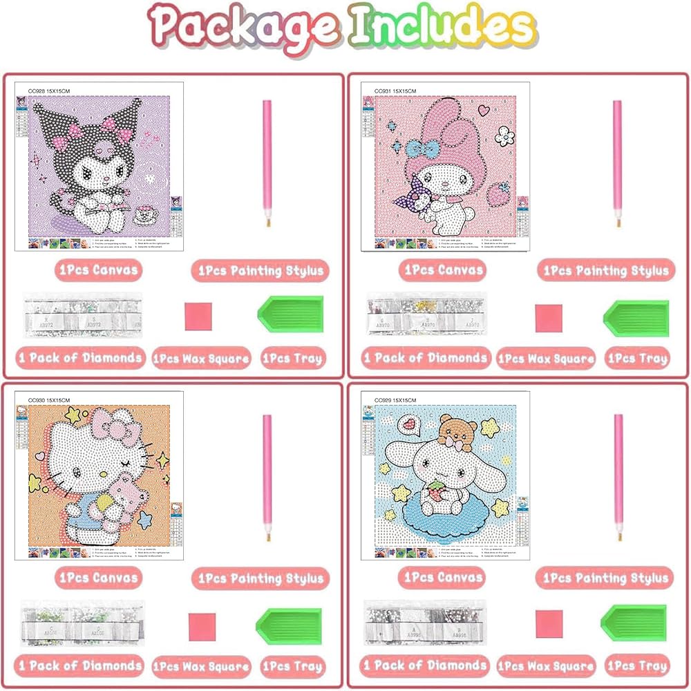 【Kids Diamond Art Kids】 The Diamond Art for Kids يشمل 4 قماش مطبوع مسبقًا ، 4 قلم ، 4 صينية ، 4 شمع ، بعض الأكياس السحابية ، ما يكفي من الماس الكريستالي (أضفنا المزيد من الماس لمنع حدوث الماس غير الكافي)