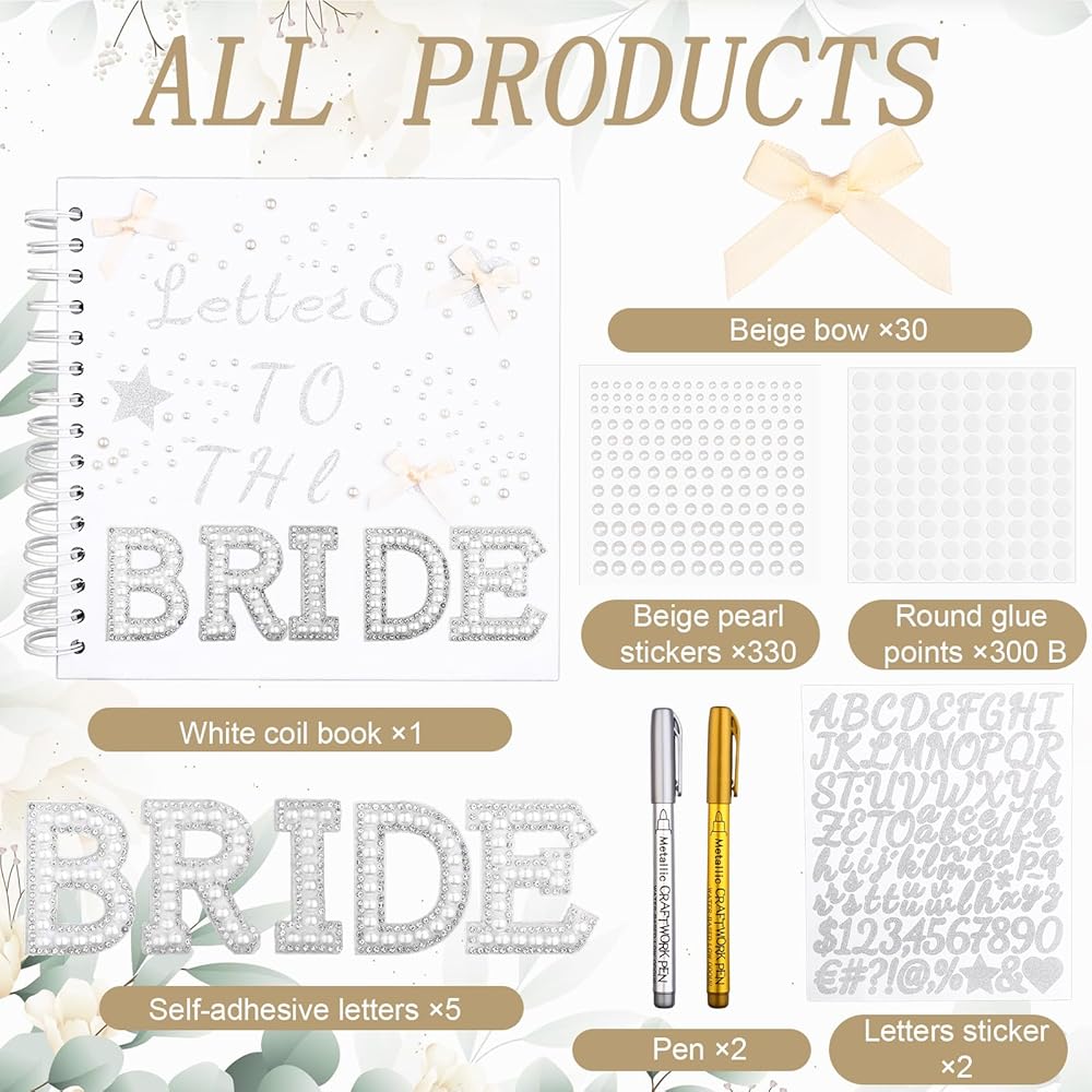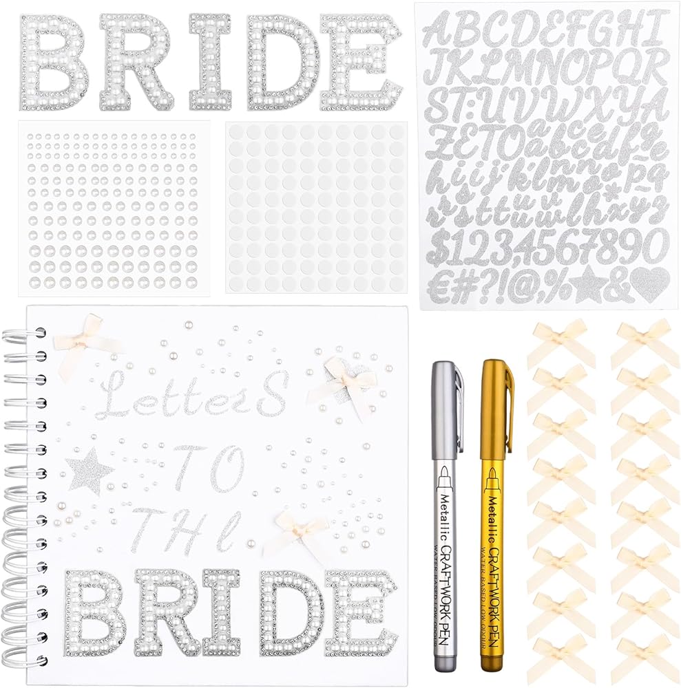 • Customizable Wedding Keepsake Kit: designed for modern brides, this comprehensive set includes a 8 x 8 inches/ 20.5 x 20.5 cm white coil notebook (20 blank pages), 2 metallic craftwork pens, 2 silver alphabet stickers, 330 pearl embellishments, self-adhesive BRIDE letters, 300 Round glue points, and 30 bows; Suitable for creating personalized guest books, memory journals, or bridal shower mementos with professional-grade crafting components