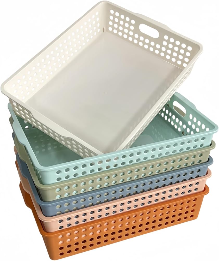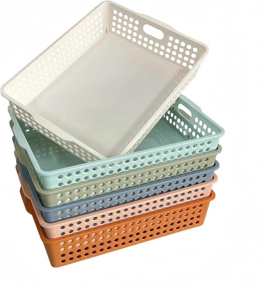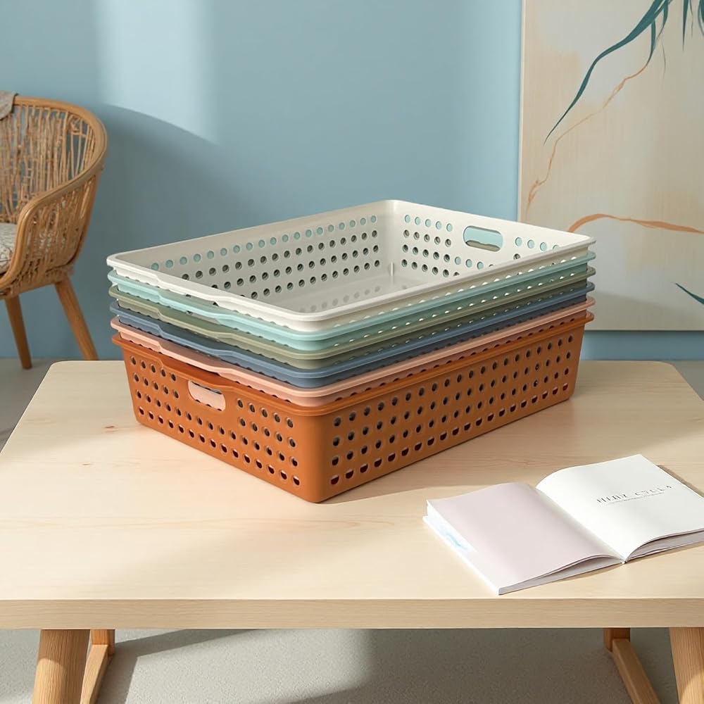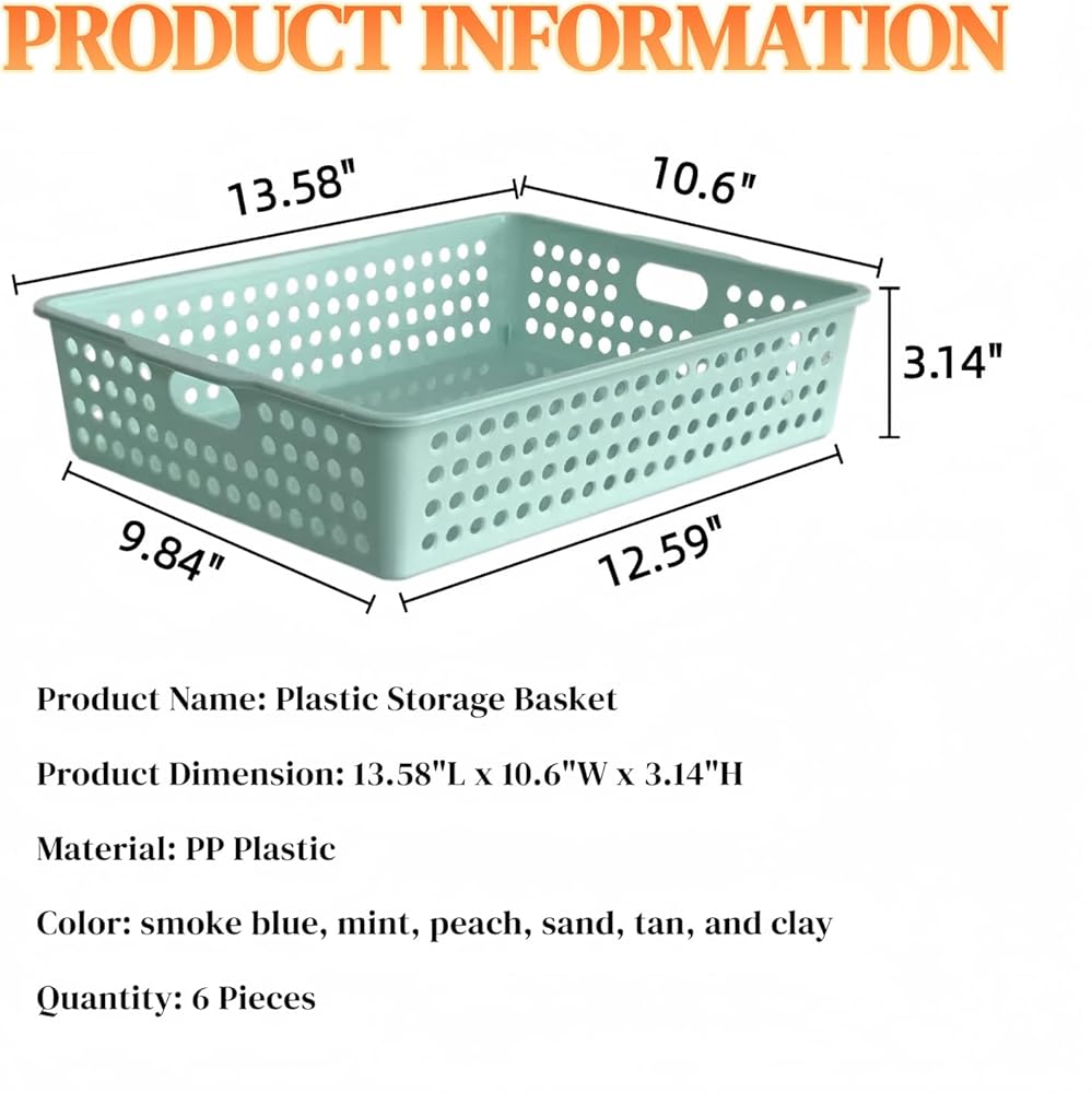 كل سلة تخزين شبكة بلاستيكية تبلغ مساحتها 13.58 "W x 10.6" D x 3.14 "H بشكل عام ، تناسب ورقة 8.5" x11 "A4.