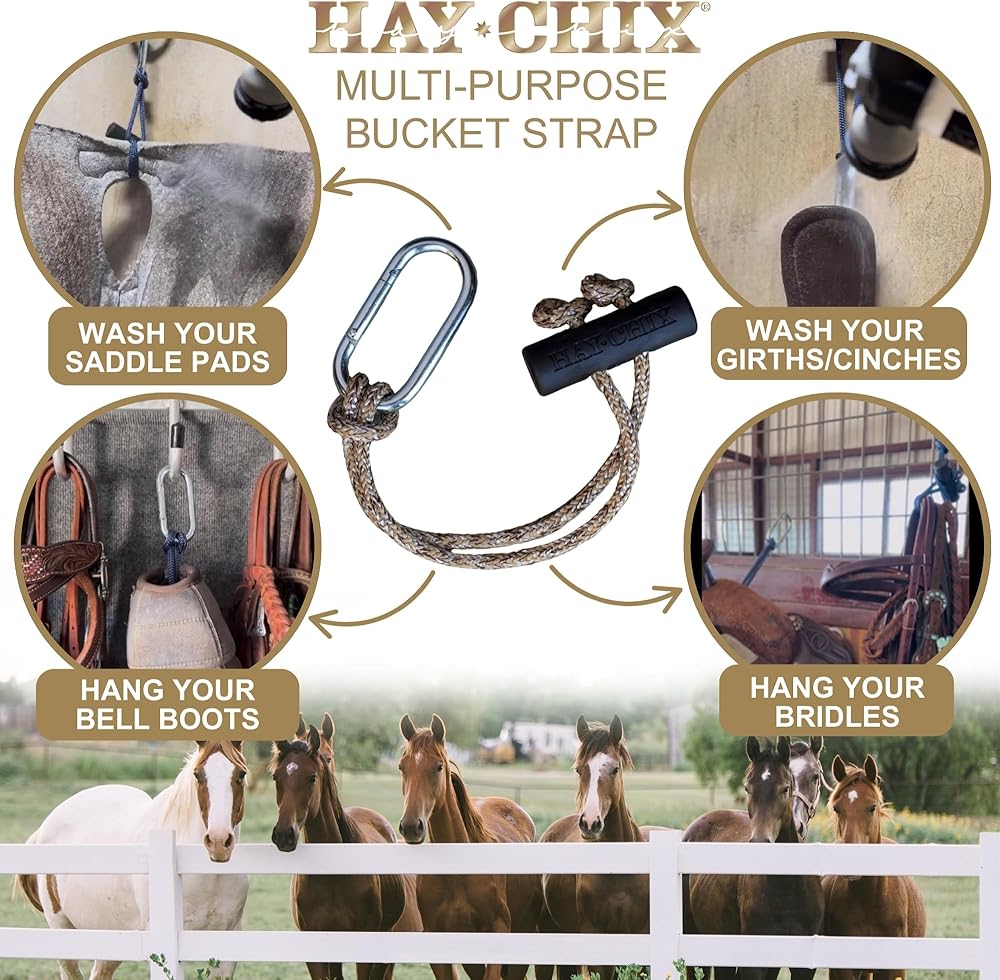 حزام دلو متعدد الاستخدامات - حزام دلو الحصان Hay Chix هو أمر لا بد منه لأي حظيرة أو مقطورة أو مستقرة. مثالي لتأمين دلو مياه الحصان أو دلو التغذية أو غيرها من ملحقات كشك الخيول ، يعد شماعات الجرافة هذه إضافة مطلوبة إلى إكسسوارات حظيرة الخيول الخاصة بك. استخدمه لتعليق سرجك في كشكك في العرض ، وتعليق Cinches و Edds حتى تجف بعد الغسيل وحتى تأمين أبواب المماطلة أو البوابات في قرصة.