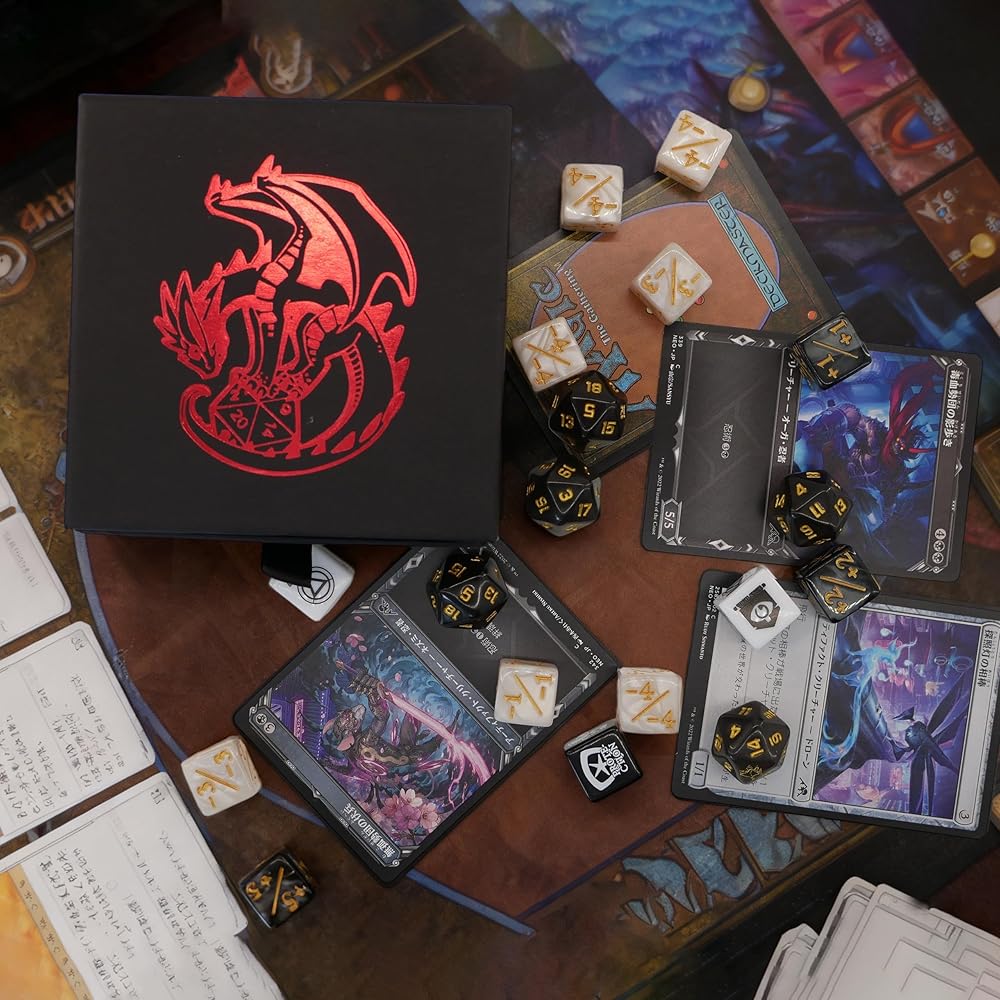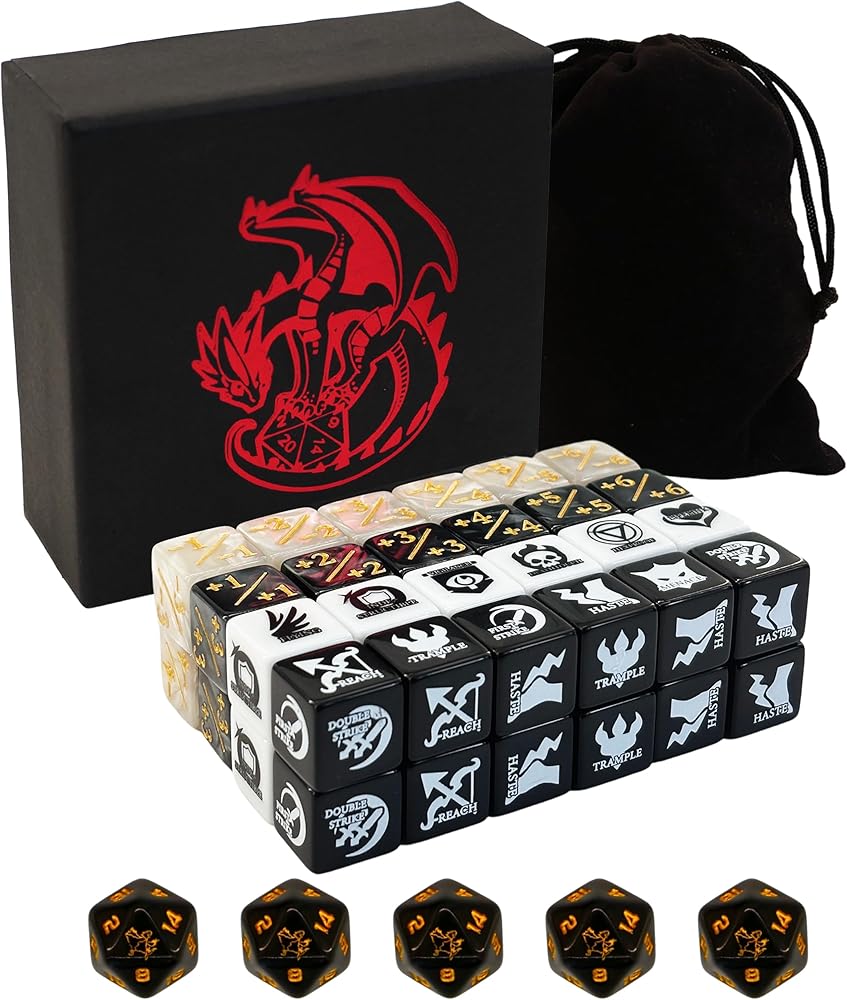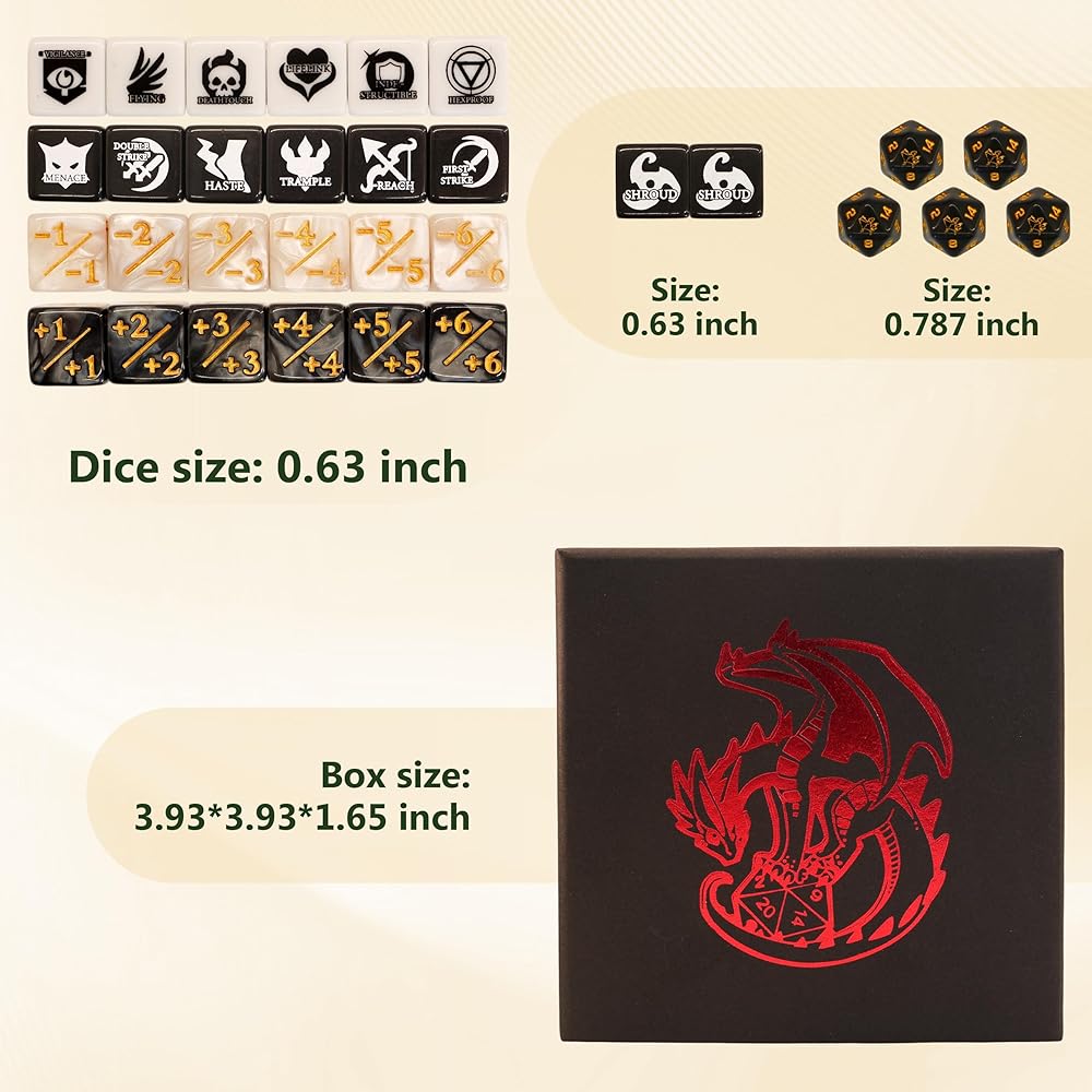 This premium MTG dice set enhances your MTG gameplay, designed for both fantasy enthusiasts and competitive players. It includes 50 dice: 24 keyword dice with essential abilities like deathtouch, indestructible, double strike, haste, trample, menace, vigilance, first strike, reach, lifelink, hexproof, and flying. Plus, 2 bonus keyword dice featuring defender, flash, protection, prowess, shroud, and unearth. The set also contains 12 -1 to -6 counter dice and 12 +1 to +6 counter dice, perfect for tracking game stats. Each of the 26 keyword dice showcases unique game-themed designs, adding a touch of Final Fantasy MTG flair to your matches. Measuring 0.63 inches (16mm), these dice are easy to handle and read. The set comes with a convenient dice storage box and a velvet pouch, making it ideal for MTG accessories collectors. Whether you're looking for MTG counters, an MTG dice set, or MTG Final Fantasy dice, this set has everything you need for your next gathering.
