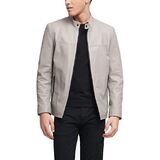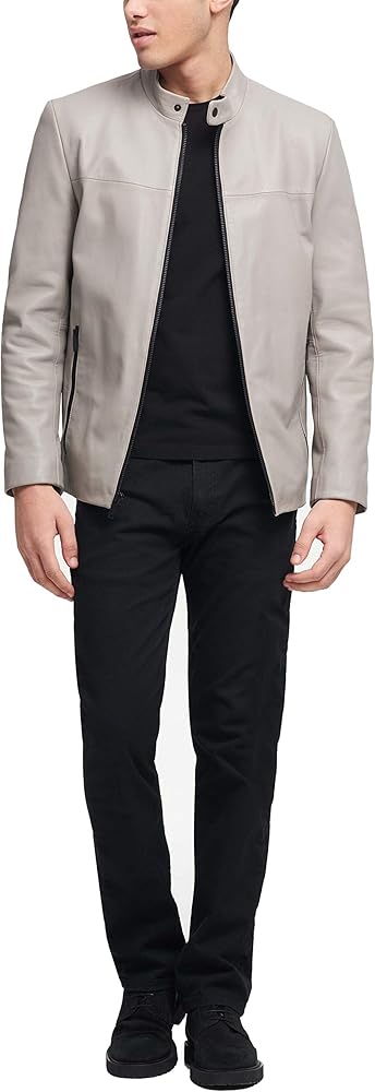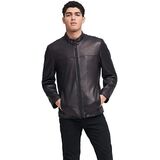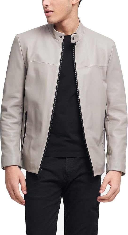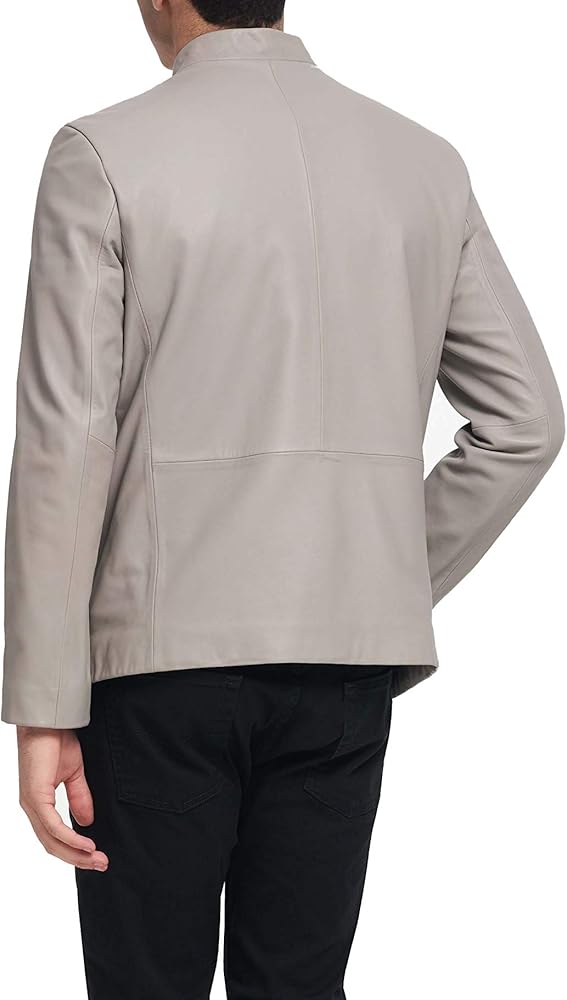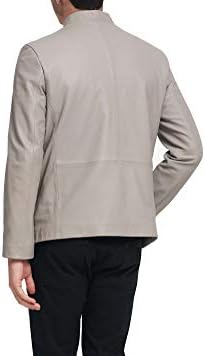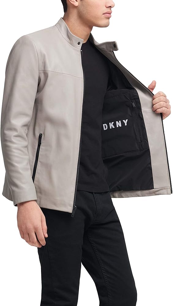 جاكيت سباق كلاسيكي من جلد الخراف الطبيعي، إغلاق بسحاب أمامي في المنتصف، قبة كلاسيكية قائمة مع إغلاق بكبسولة، شعار دي كيه ان واي المعدني على منتصف الجزء الخلفي للرقبة، جيبان سفليان بسحاب وجيب داخلي بسحاب.