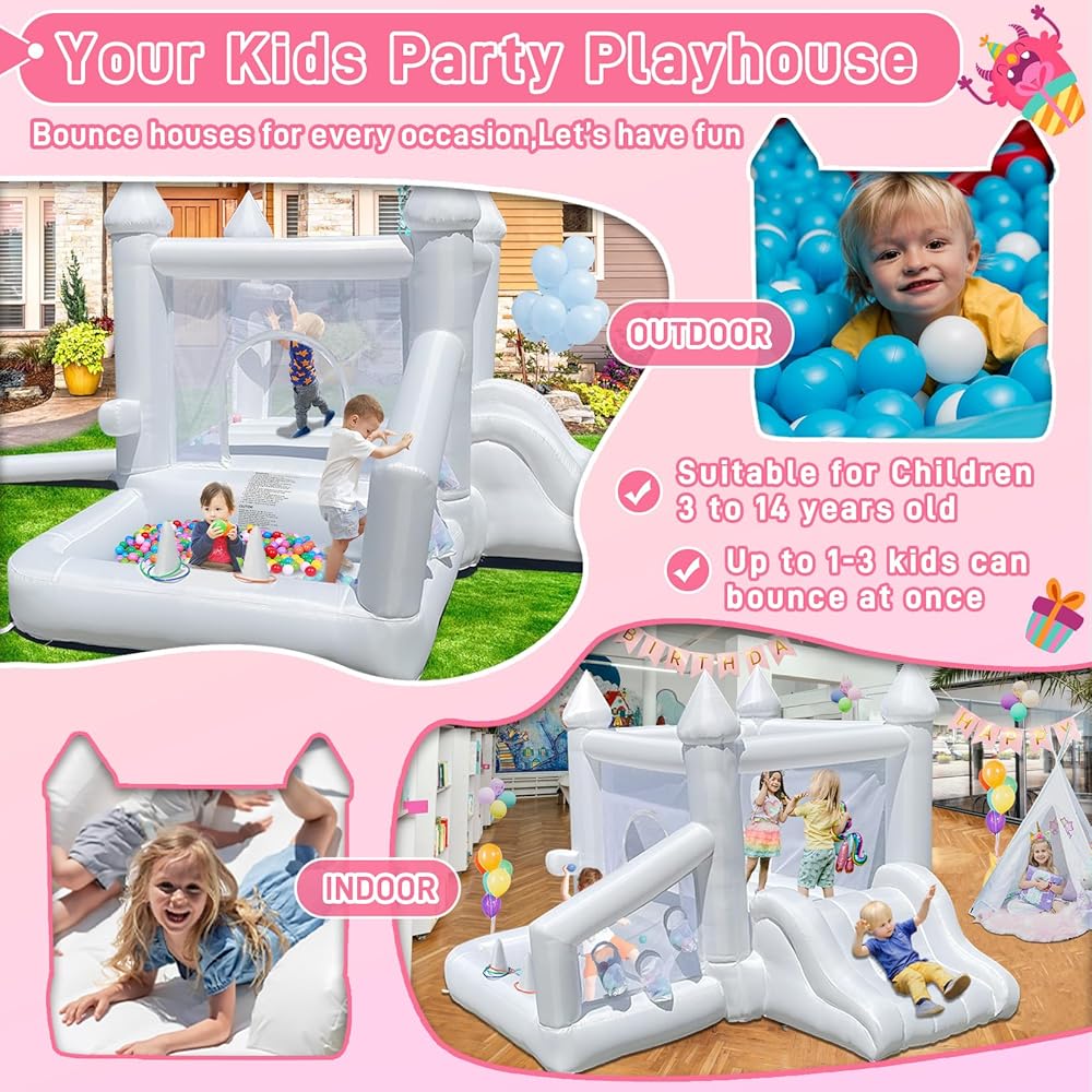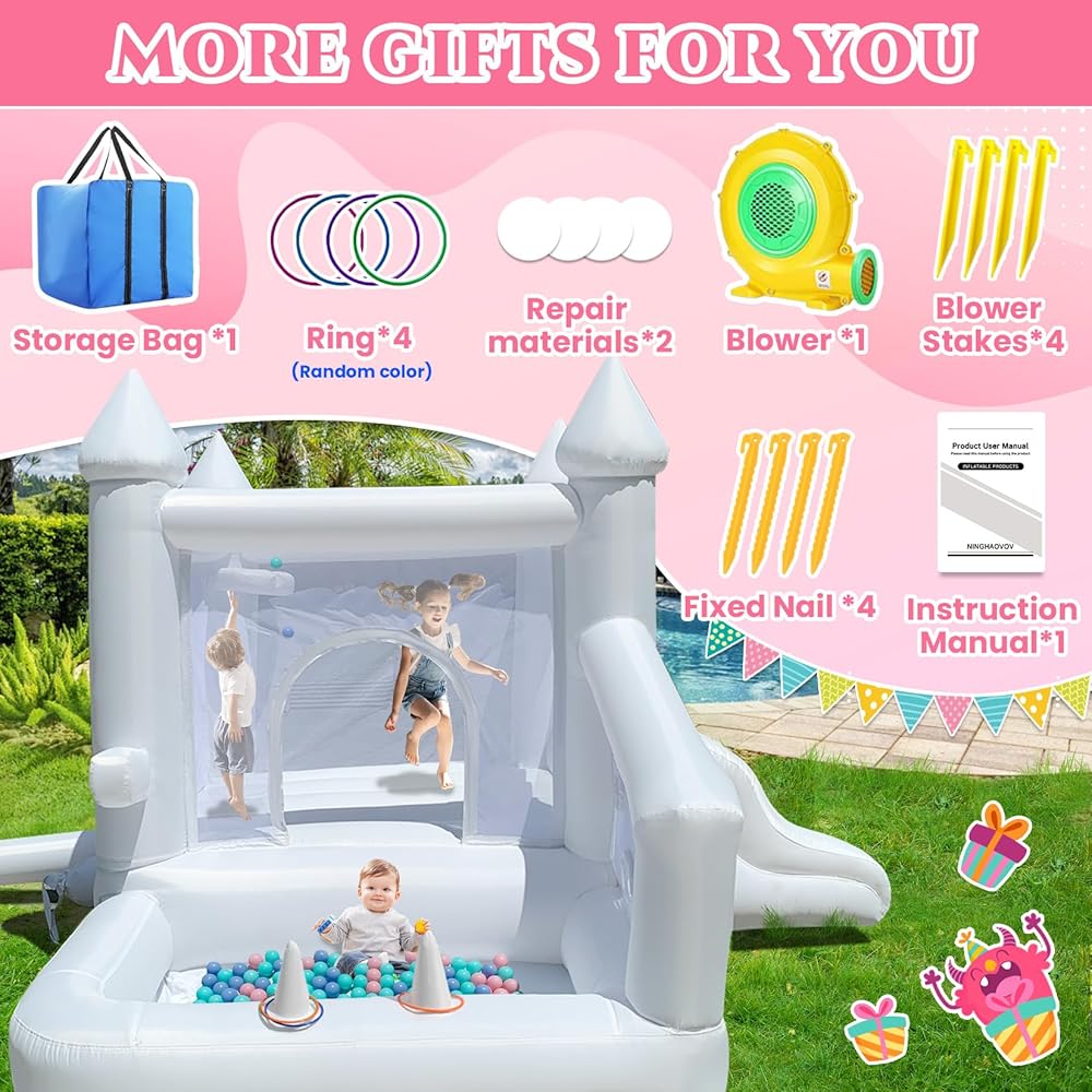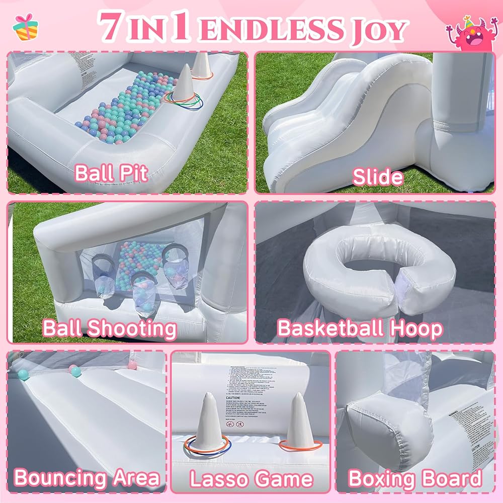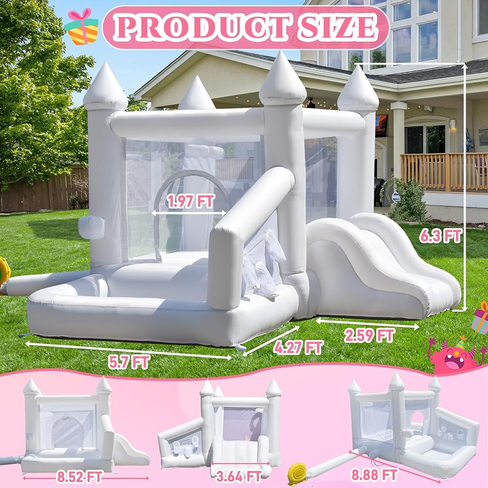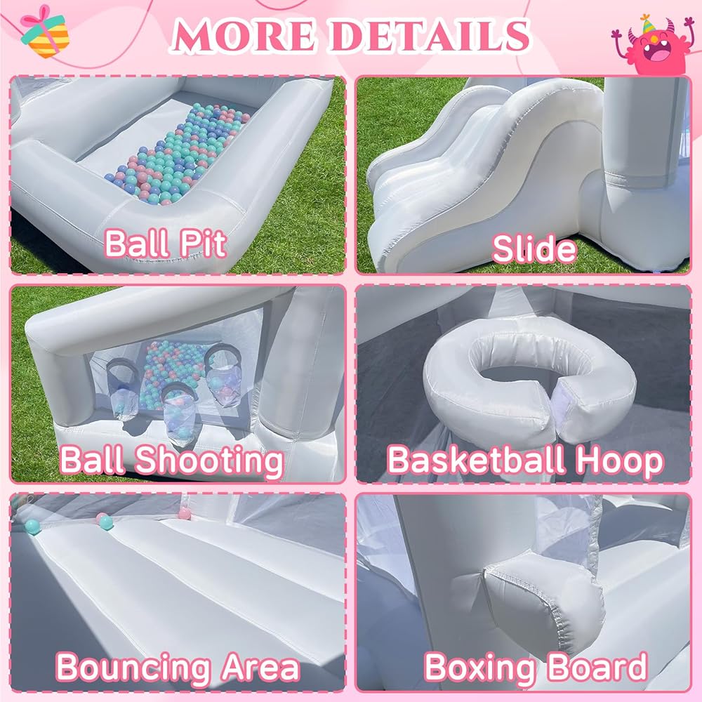 🏰【 Bounce House】 تم تجهيز منزل Bounce White مع مجموعة متنوعة من مناطق اللعب ، ويسمح Slide للمزيد من الأطفال باللعب في نفس الوقت. تم تصميم منطقة الارتداد بحافة كرة سلة تسمح بالارتداد والإطلاق.
