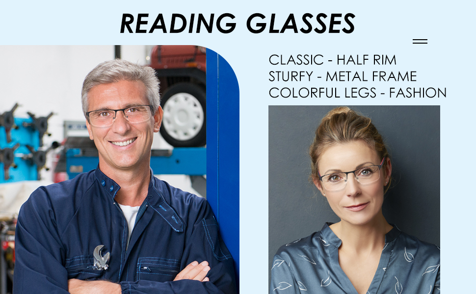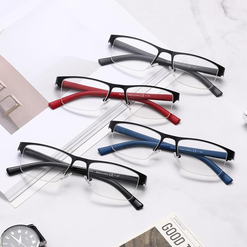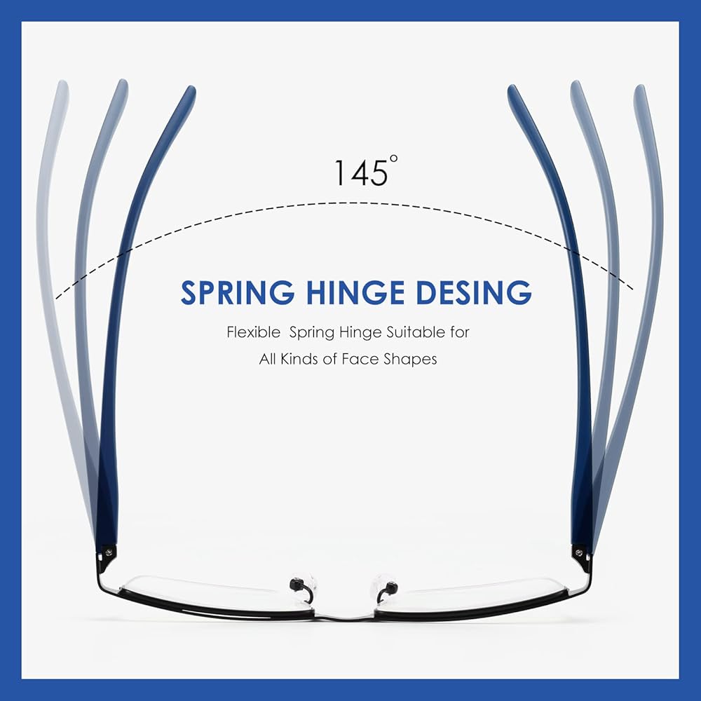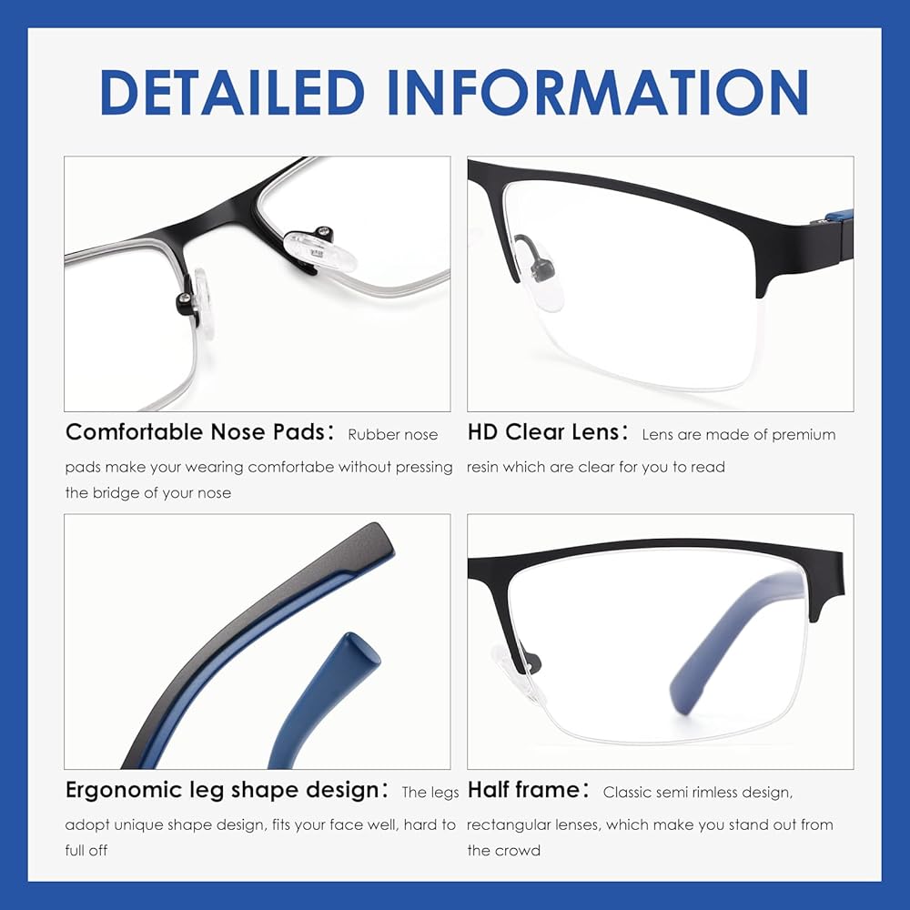 نظارات قراءة مريحة وقوية للرجال - إطارات معدنية متينة صديقة للبيئة تضمن عدم تشويه الإطار أو تلفه بسهولة. يمكن لوسادات الأنف المصنوعة من السيليكون الناعمة الصديقة للبشرة والخالية من الحساسية أن تقلل العبء على أنفك وتسمح بأقصى قدر من الراحة والمرونة. جميع النظارات مجهزة بمفصلات زنبركية لتمنحك تجربة ارتداء مريحة