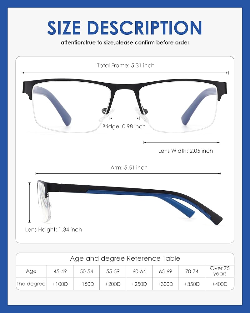 عدسة فائقة الوضوح بدرجات دقيقة - تكوين درجة احترافي ودقيق مع عدسات الراتنج عالية الدقة: نظارات قراءة للرجال 1.0، 1.25، 1.5، 1.75، 2.0، 2.50، 3.00، 3.50، نفاذية جيدة، واضحة بألوان غير مشوهة، لا مزيد من عدم وضوح الرؤية.