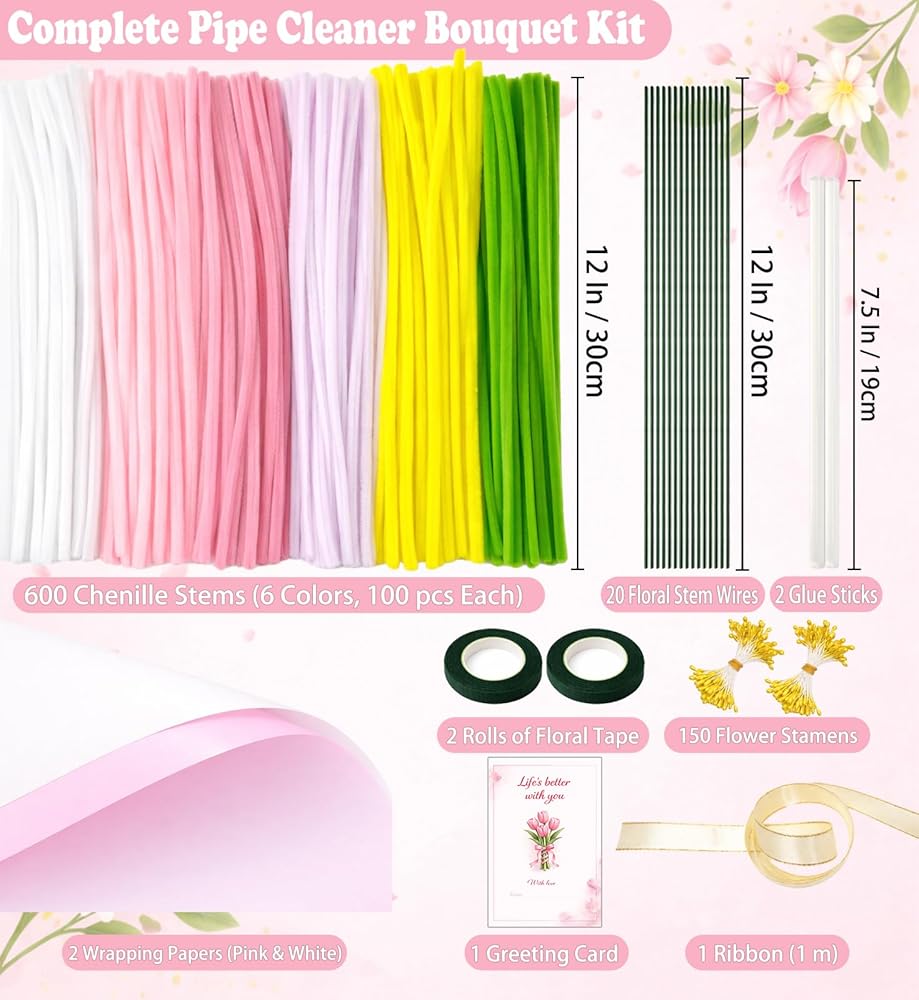 مجموعة تنظيف الأنابيب الزهرية باللون الوردي، 600 قطعة من منظفات الأنابيب للزهور، مجموعة حرفية لتنظيف الأنابيب، مجموعة صنع الزهور من سيقان الشنيل مع أسلاك الأزهار، الشريط، أعواد الصمغ، السداة، ورق التغليف، بطاقة الشريط