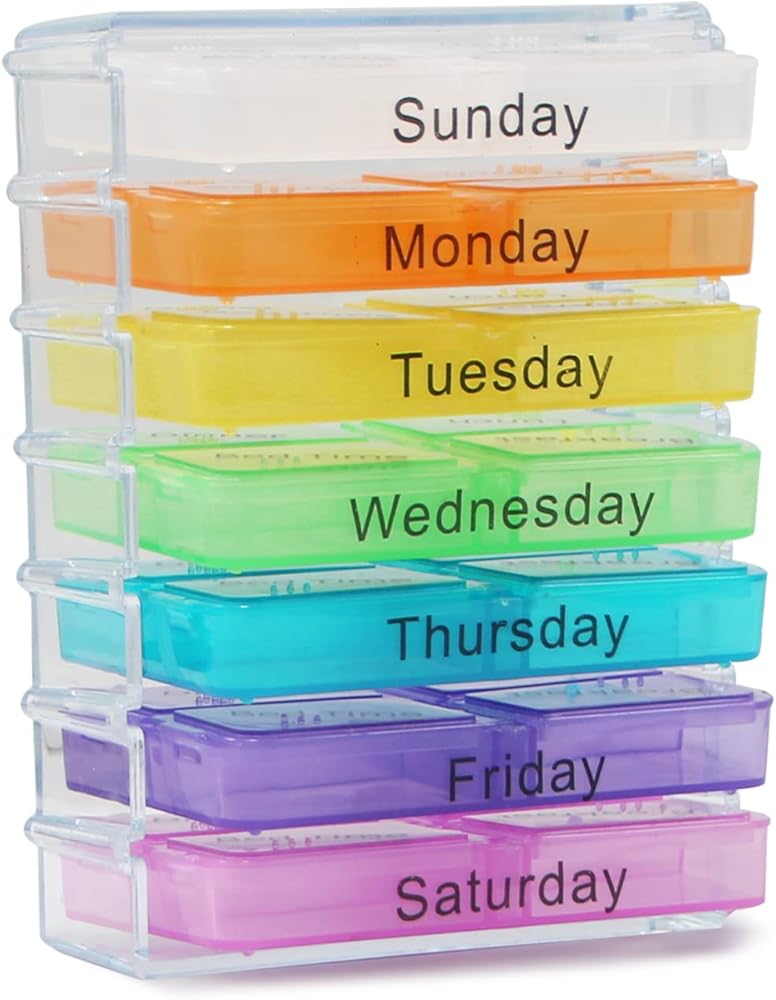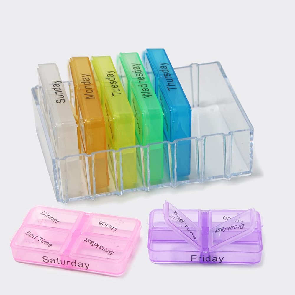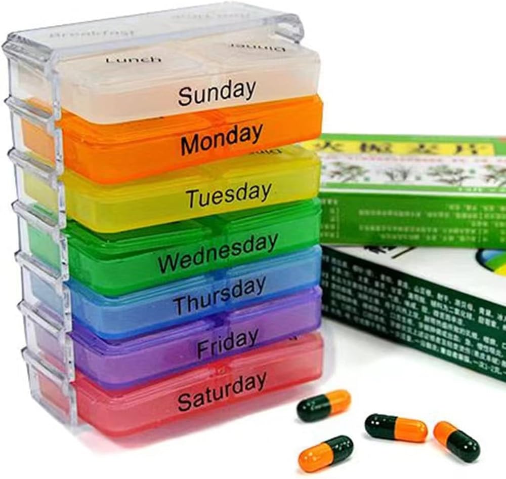 منظم أسبوعي: منظم حبوب الدواء 7 أيام و4 مرات في اليوم، مصمم لتخزين الكثير من الحبوب والفيتامينات من جميع الأحجام والأشكال في مكان واحد. يجعل إدارة وصفة الدواء الأسبوعية أمرًا سهلاً.