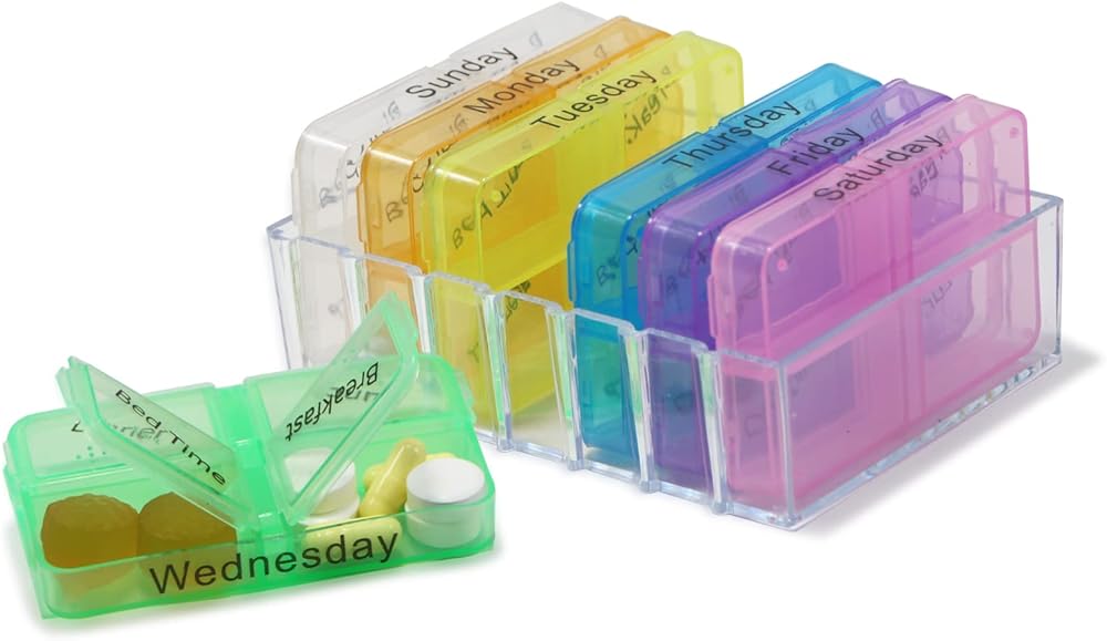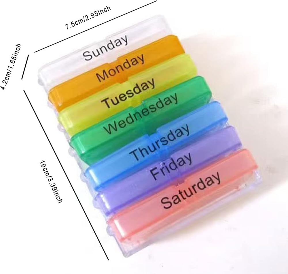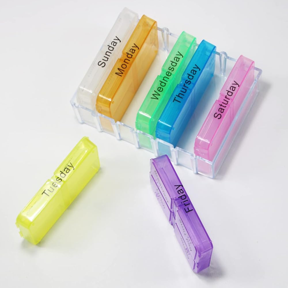 منظم أسبوعي: منظم حبوب الدواء لمدة 7 أيام، مما يجعل إدارة وصفاتك الطبية اليومية أمرًا سهلاً، وجيد للمساعدة في الاستمرار في التتبع.