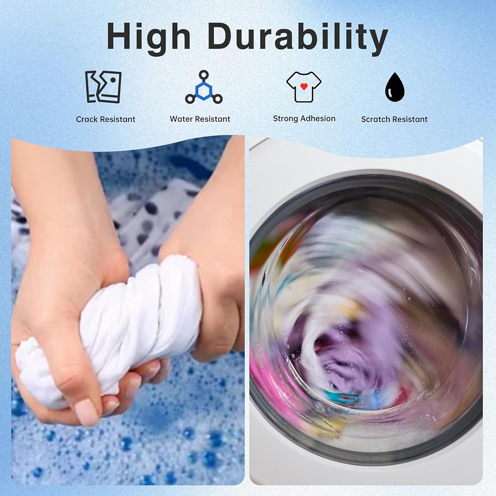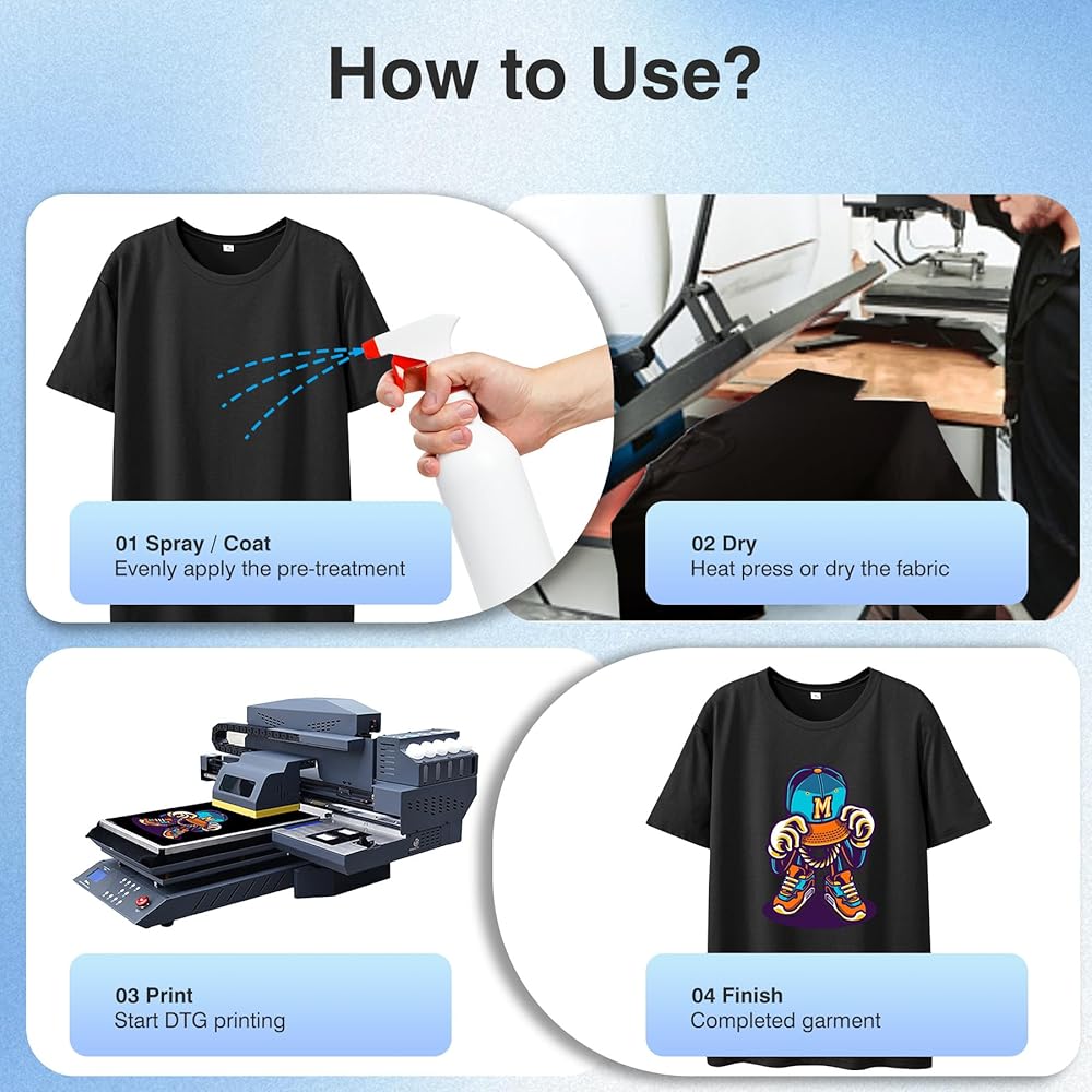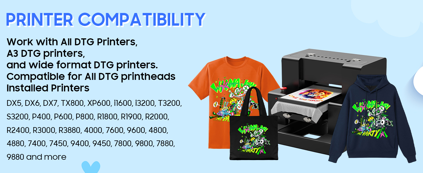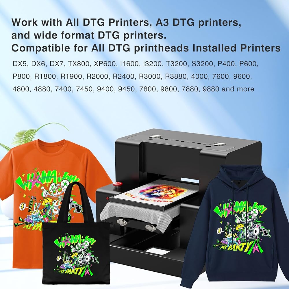 التوافق الواسع النسيج: يعمل على القطن ، ومزيج البوليستر ، وغيرها من المنسوجات الجاهزة لـ DTG ، وصياغة خصيصًا للملابس الداكنة ، والمثالية للقمصان ، والغطاء ، وحقائب الحمل ، والمزيد
