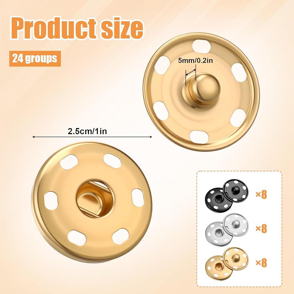 24-Pack Carded Snaps: 24 sets of 1"/25 mm snap fasteners pre-sorted on storage cards. Metal snaps for fabricprevent component loss-each card contains matching cap/socket pairs for sewing projects