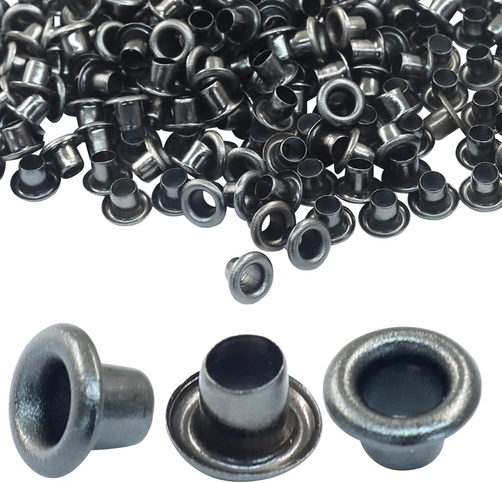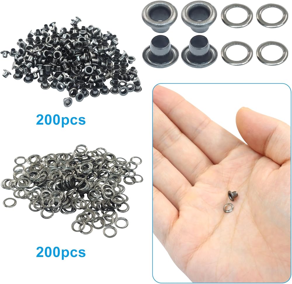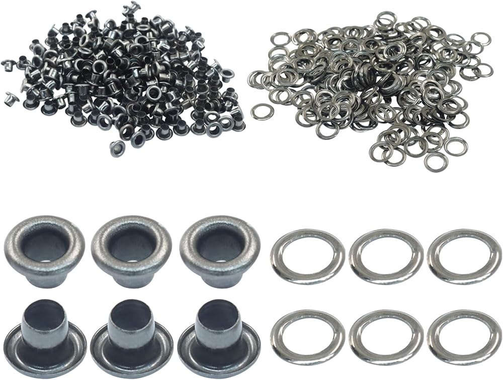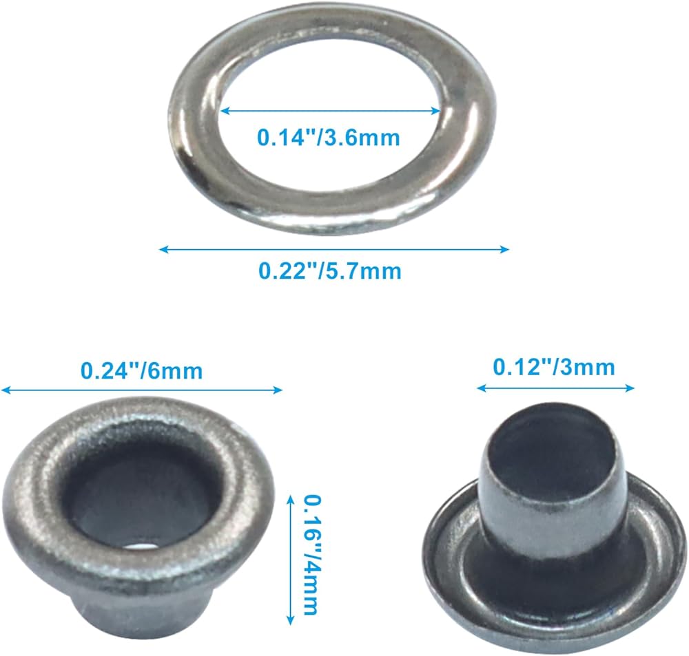 Two-Part Metal Grommet Kit with Washers: This eyelets and grommets kit is constructed from robust iron with a rust-resistant plating. The two-part design combines a grommet with a matching washer to create a secure hold, making it a reliable choice for projects on bags, shoes, and outdoor gear.