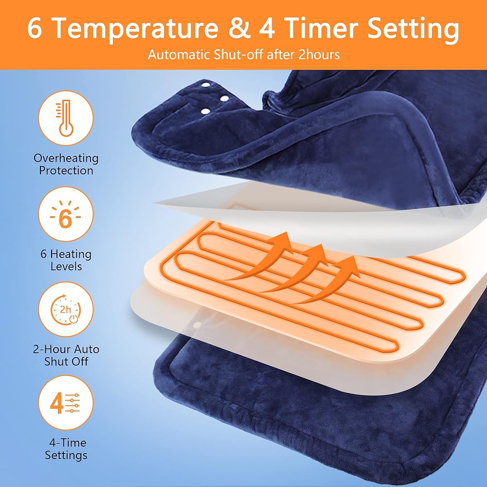 6 إعدادات تسخين و4 مؤقتات للإيقاف التلقائي: توفر وسادة التسخين الموزونة 6 إعدادات تسخين (104 درجة فهرنهايت ~ 140 درجة فهرنهايت) لتلبية احتياجاتك ومجهزة بـ 4 إعدادات توقيت، نطاق إعداد الإيقاف التلقائي هو 0.5 ساعة، 1 ساعة، تضمن تقنية الإغلاق التلقائي 1.5 ساعة و2 ساعة سلامتك المطلقة في أي مناسبة وتلبية احتياجاتك المختلفة.