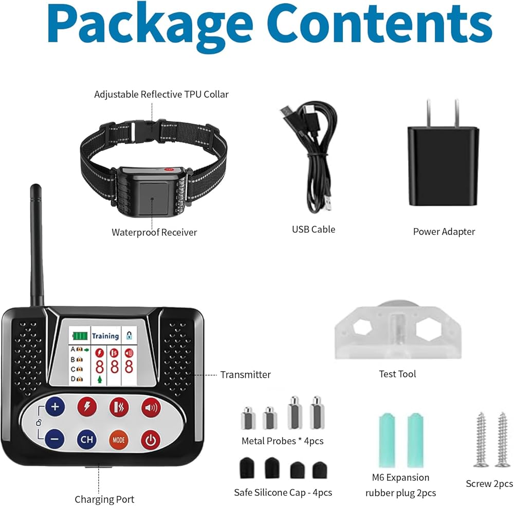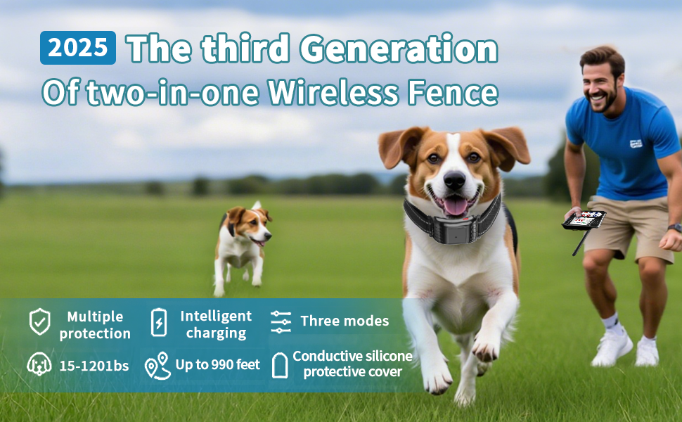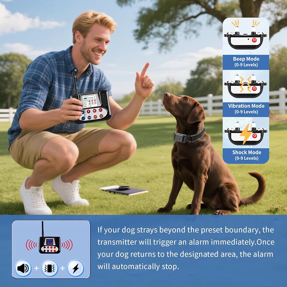 سياج الكلب اللاسلكي: يجمع نظام السياج الكلب اللاسلكي هذا بين الأسوار اللاسلكية للكلاب مع طوق تدريب عن بعد ، مما يوفر حلاً فعالاً لتدريب الكلاب واحتوائها. تعزز شاشة LCD الكبيرة قابلية الاستخدام ، مما يسهل مراقبة سلامة الكلب وحريتك.