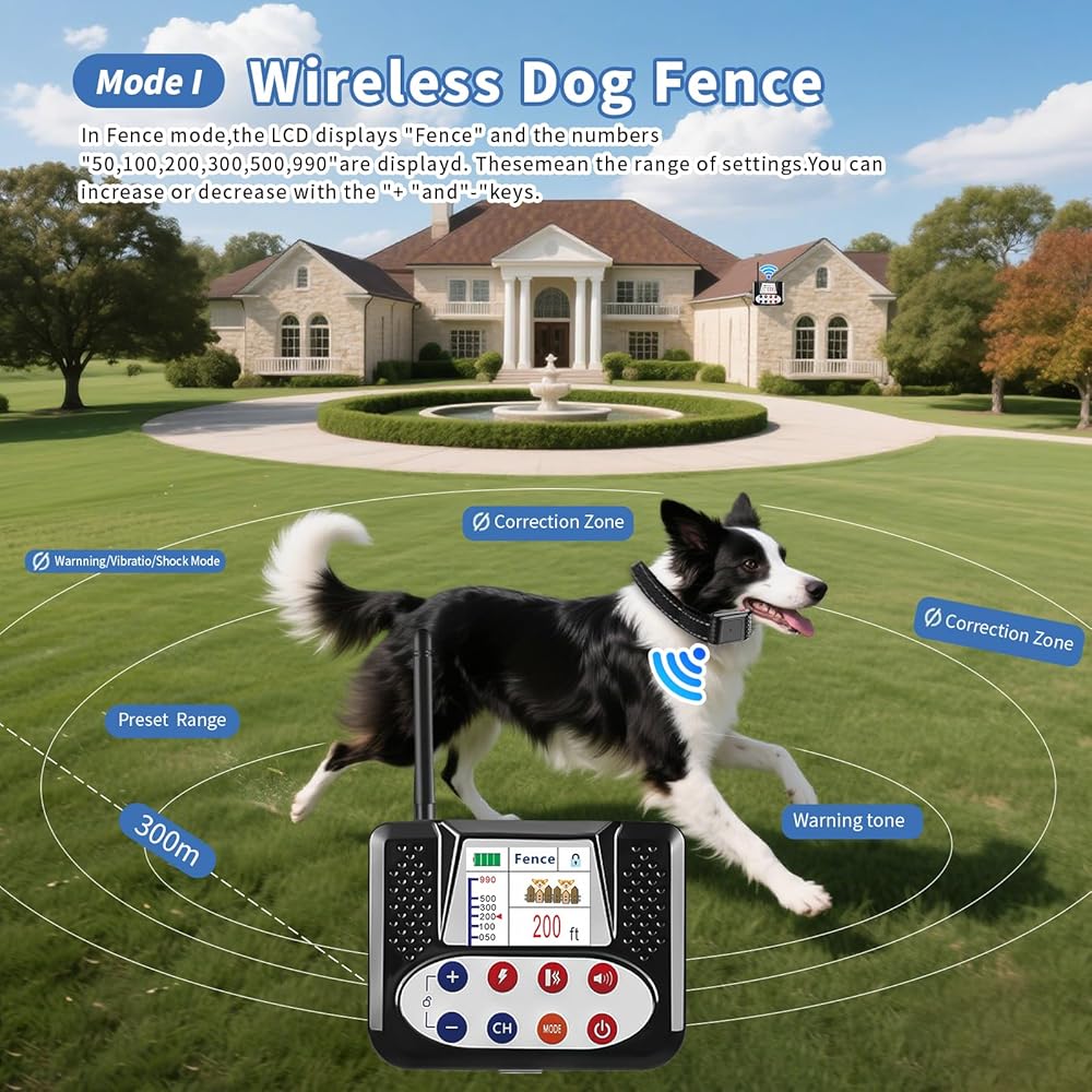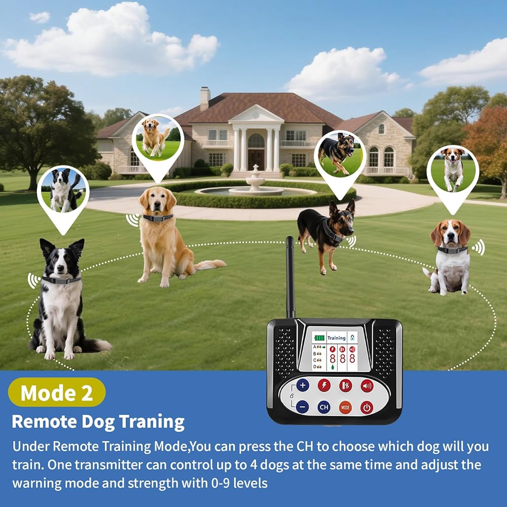 السياج اللاسلكي وضع طوق التدريب: يدعم سياج الكلب اللاسلكي لدينا ما يصل إلى أربعة كلاب في وقت واحد. في وضع السياج ، يتصل جهاز إرسال واحد مع أطواق الكلاب المتعددة تلقائيًا ، ويغطي نطاق إشارة من 50 قدمًا إلى دائرة نصف قطرها 990 قدمًا. يستخدم وضع أطواق التدريب لهجة تحذير تليها الاهتزاز والصدمة الطبية الخفيفة في توجيه الكلب الخاص بك بحرارة.