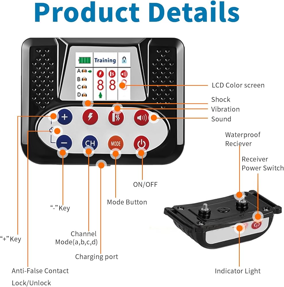 الاهتزاز والصدمة القابلة للتعديل: تخصيص تجربة التدريب مع 3 وظائف قابلة للاختيار مباشرة من اللوحة: الصوت ، الاهتزاز ، والصدمة. يمكنك بسهولة ضبط المستويات 0-9 على الشاشة ، مما يتيح لك العثور على الإعداد المناسب بناءً على حجم الكلب الخاص بك (مناسب لجميع الكلاب لجميع الكلاب) وذات الحساسية للمطابقة في الحافة غير المرئية ، وحشي الكلب الكهربائي ، أو أدوات الكلب.