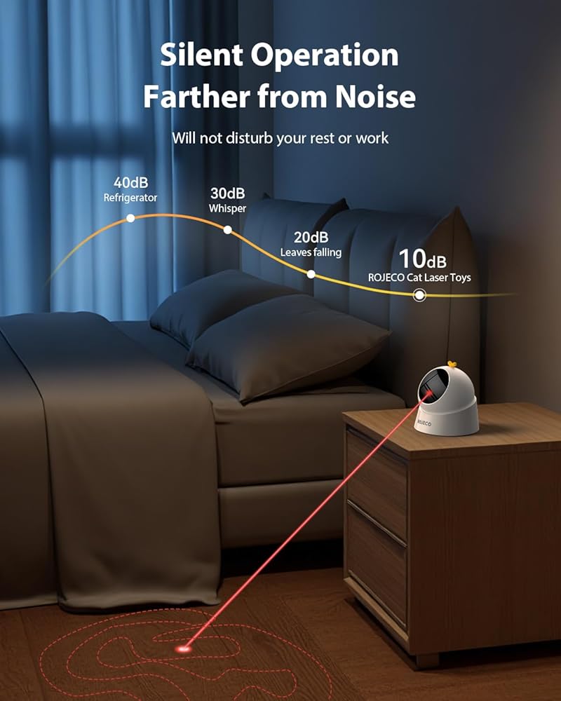 ROJECO AUTO LASER CAT TOY - مسار حركة عشوائي ، قاعدة 360 درجة مغناطيسية ، قم بالهدوء ، قابل لإعادة الشحن مع بطارية 1000 مللي أمبير في الساعة ، نومًا تلقائيًا و 3 سرعات ، آمنة للقطط ، ألعاب القطط التفاعلية للملل الداخلي