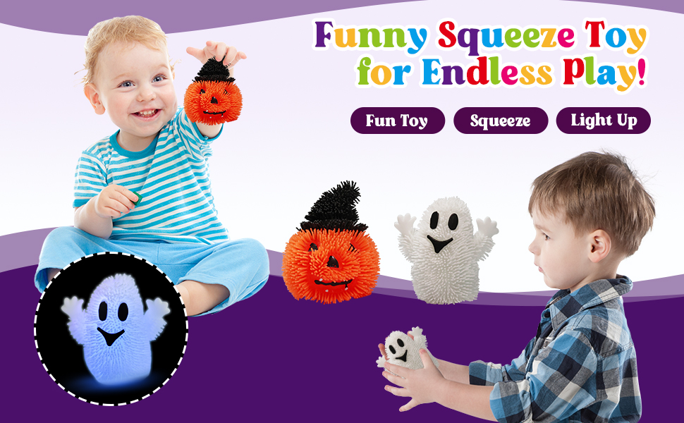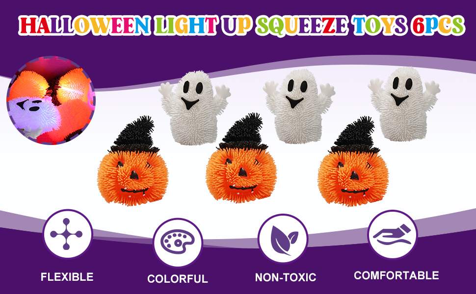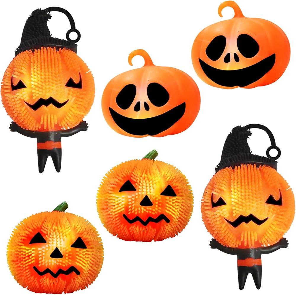 أطفال هالوين المفضل: هذه المجموعة من 6 ألعاب Halloween Squiez Light-Up ستفقد طاولة عشاء الهالوين الخاصة بك. يضم أشواك مطاطية ناعمة ومركز إضاءة ملون. متوفر في تصميمين (Ghost and Pumpkin) ، ثلاثة من كل منهما.