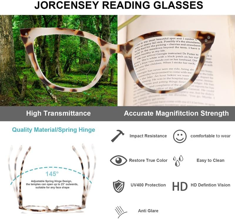 👓【عدسة مطورة مضادة للضوء الأزرق】عدسة JORCENSEY المطورة المضادة للضوء الأزرق مع تقنية مضادة للانعكاس مكونة من 10 طبقات والتي يمكنها تصفية 85% من الأشعة الزرقاء الضارة من أجهزة الكمبيوتر والهواتف الذكية، وتقليل إجهاد العين والصداع الوهج. عند ارتداء نظارات القراءة ذات الضوء الأزرق، سوف تحب هذه التجربة البصرية بعد القراءة لفترة طويلة.