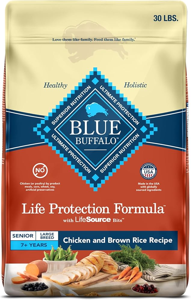 Contains: One (1) 34-lb bag of BLUE Life Protection Formula Large Breed Senior Dry Dog Food, Chicken and Brown Rice Recipe