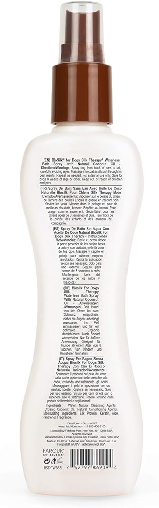• Easy to use — made with the same classic ingredients as the original biosilk line for humans, this waterless dog shampoo sprays right onto your dog's coat, cleansing without the mess of a full bath