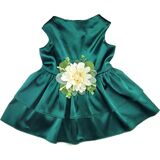 Our stretchy satin dress is offered in six color choices, with a center faux ivory floral or cluster as shown, surrounded by soft lambs ear, and succulent foliage. Sizes XS- XL include a leash loop. Perfect for all day wear, the underside of our dresses all feature a cutout layer to allow for pottying while partying! Breathable fabric, with plenty of stretch, goes on over the head.