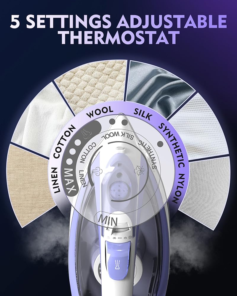 𝐒𝐔𝐈𝐓𝐀𝐁𝐋𝐄 𝐅𝐎𝐑 𝐀𝐋𝐋 𝐅𝐀𝐁𝐑𝐈𝐂𝐒: يتميز هذا الحديد بالملابس ببخار قابل للتعديل و 3 إعدادات درجة حرارة ، مما يتيح لك تكييف الحرارة والبخار لتناسب الأقمشة المختلفة. من الحرير والبوليستر إلى القطن والدينيم ، يتكيف بسهولة مع احتياجاتك - مما يثير نتائج احترافية ورعاية لطيفة لكل ثوب