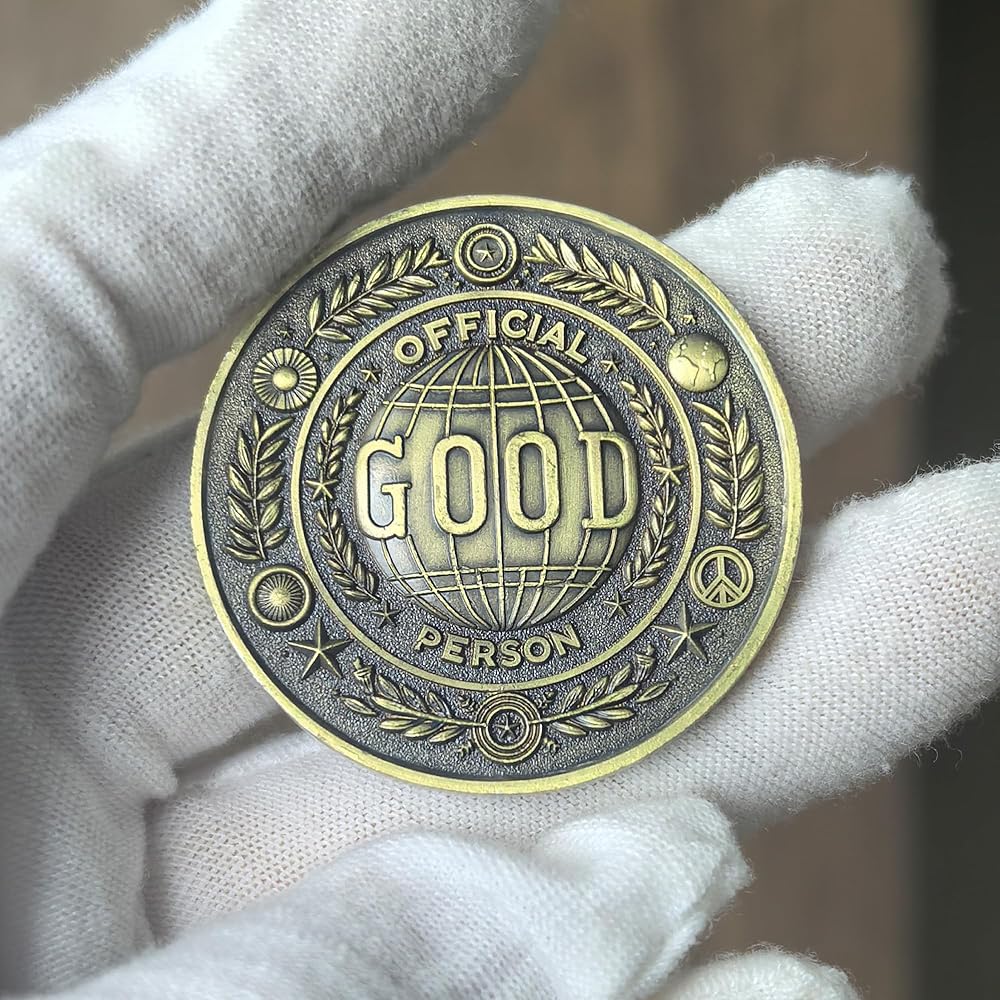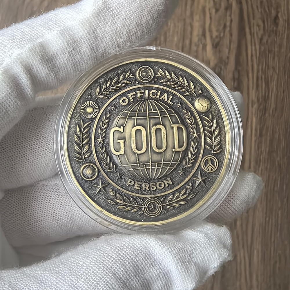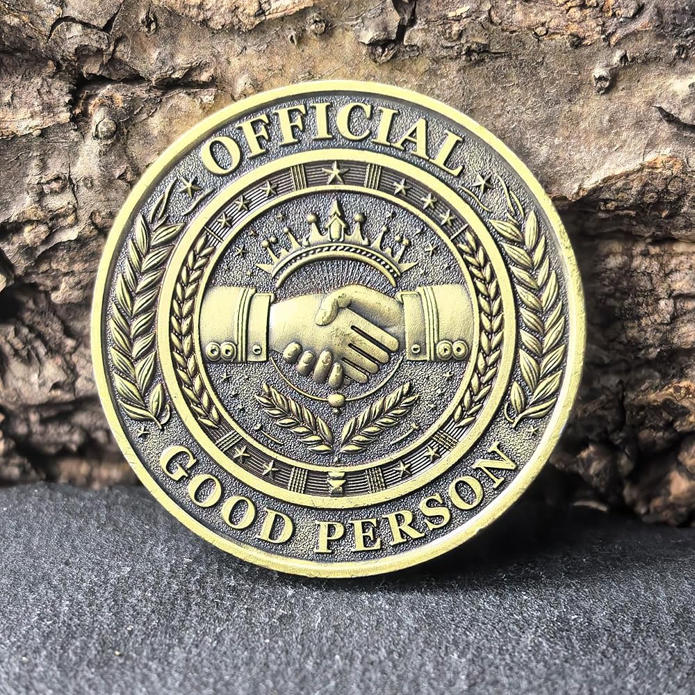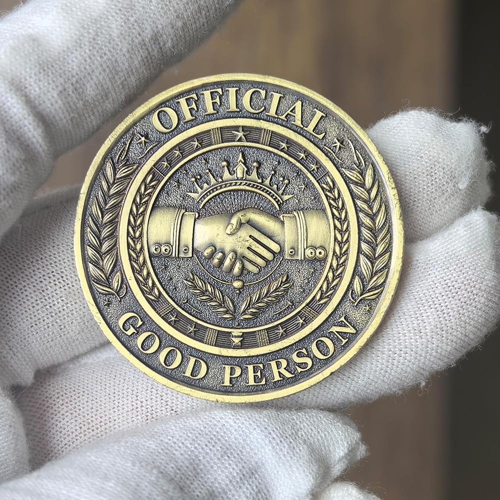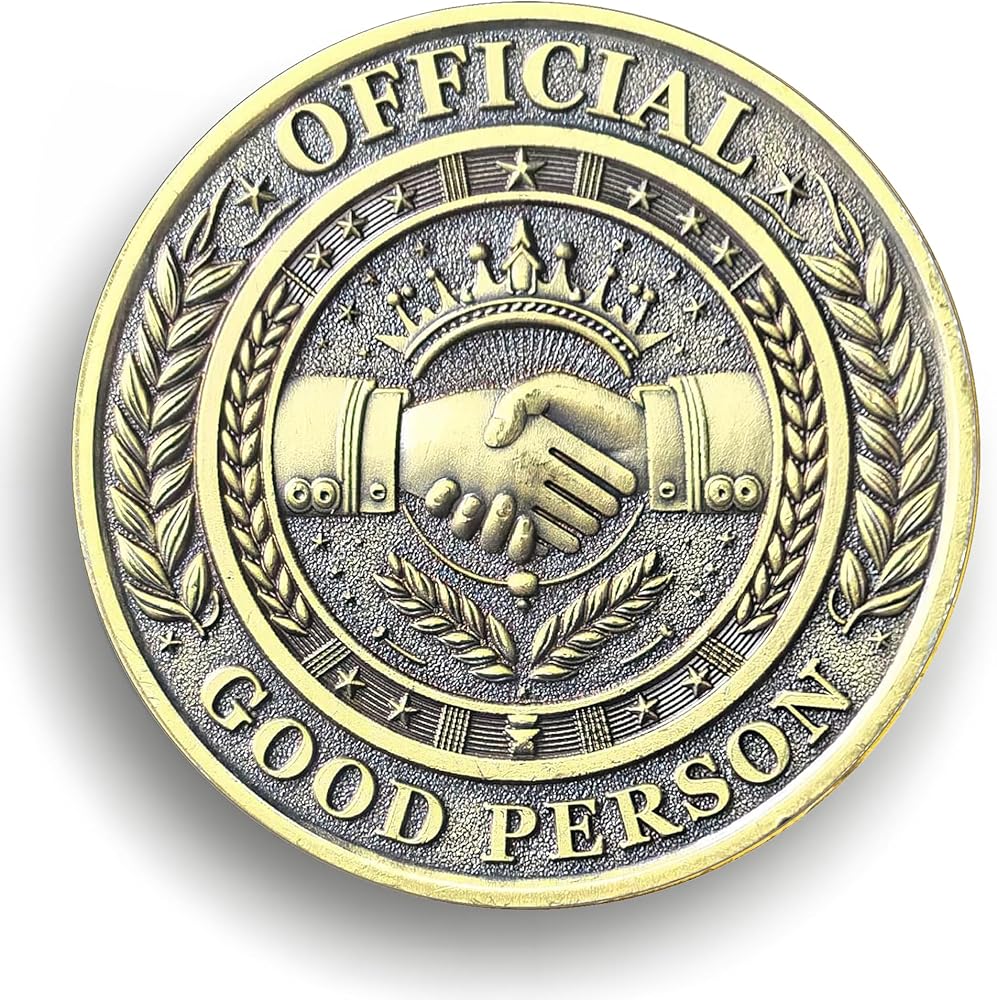 Handshake of Unity: Back side displays a handshake beneath a crown, symbolizing trust, partnership, and honorable conduct; the phrase “Official Good Person” reinforces the recognition of commendable character and actions