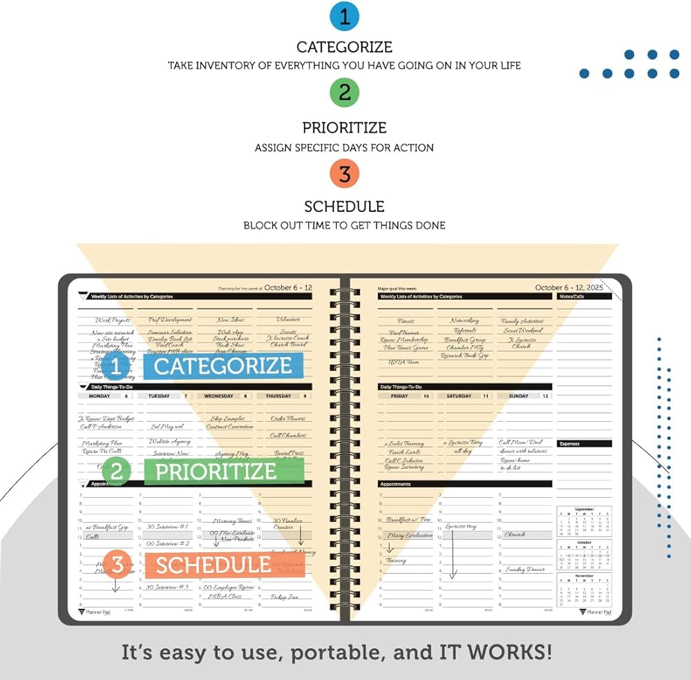 يتيح لك العرض الأسبوعي لمدة 7 أيام مع منظم Planner Pad أن ترى الصورة الكبيرة لكل ما تواجهه كل أسبوع. كل يوم يقوم نظام التحويل بتوجيه انتباهك إلى المهام التي يجب القيام بها. ستكون أكثر تركيزًا وتنظيمًا في 30 يومًا مضمونة أو استرداد الأموال