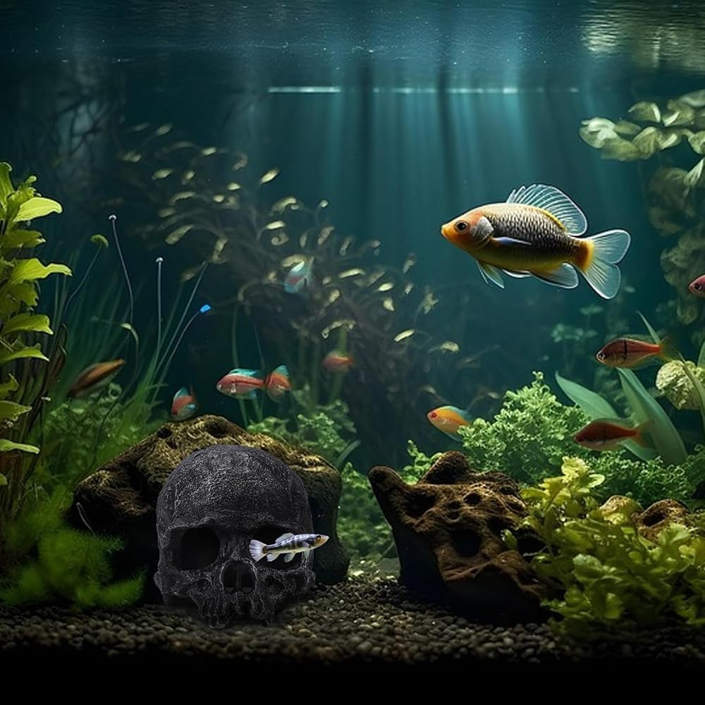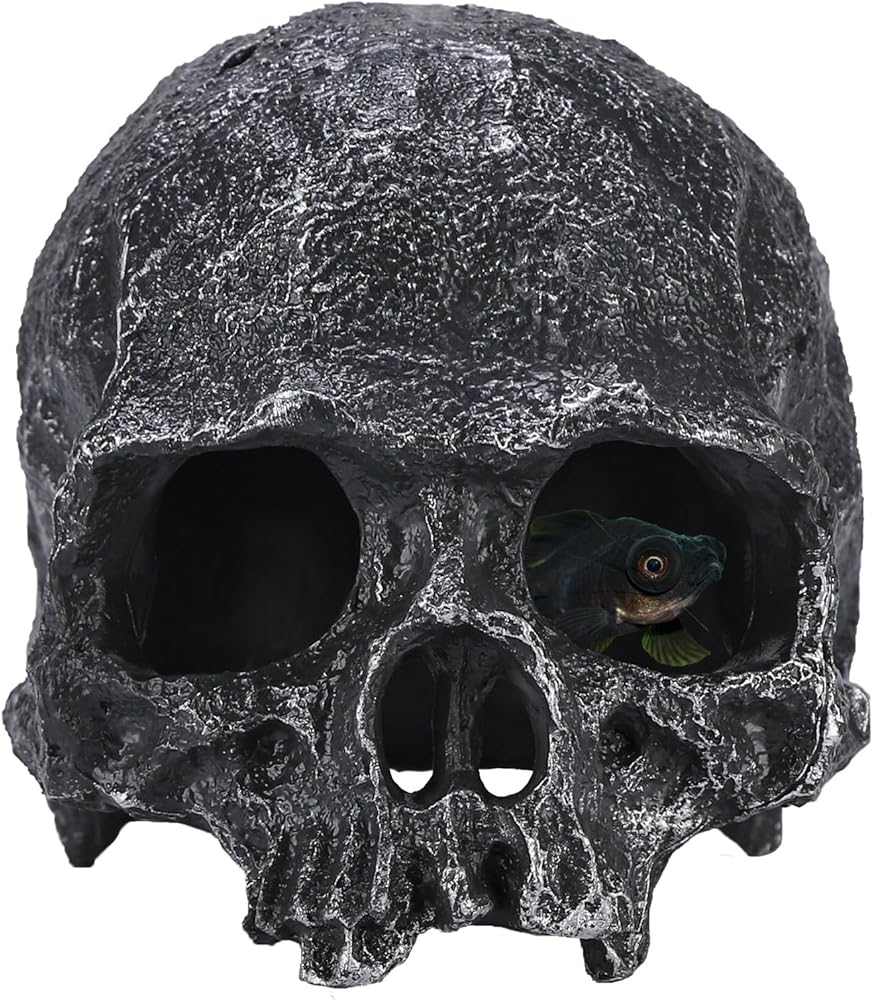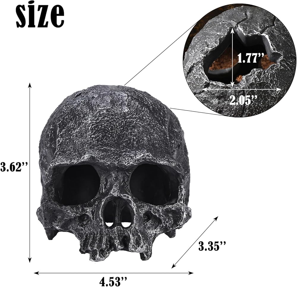 Unique skull aquarium decor - This aquarium hide adopts a unique skull-shaped design. The delicate details and exquisite textures restore the lifelike details of the skull, creating a strong visual impact. The realistic design provides an interesting living space for reptiles, which is suitable for various aquarium landscaping styles, like the dark style or the retro style, enhancing the overall layering and aesthetic appeal of the landscape.