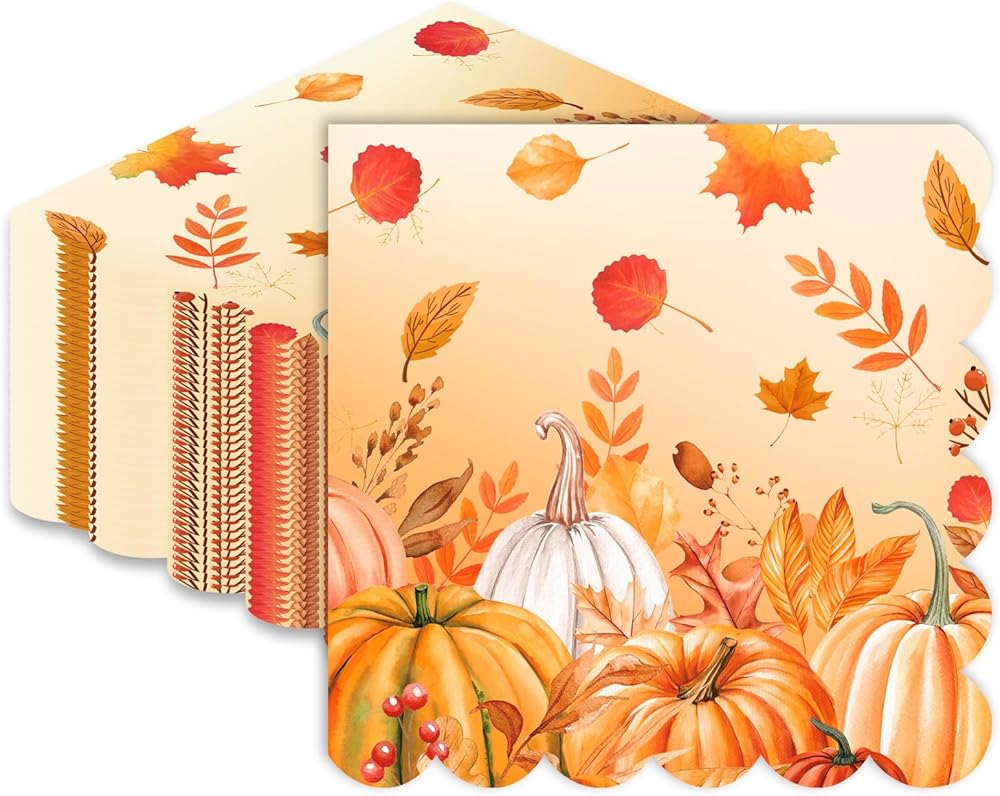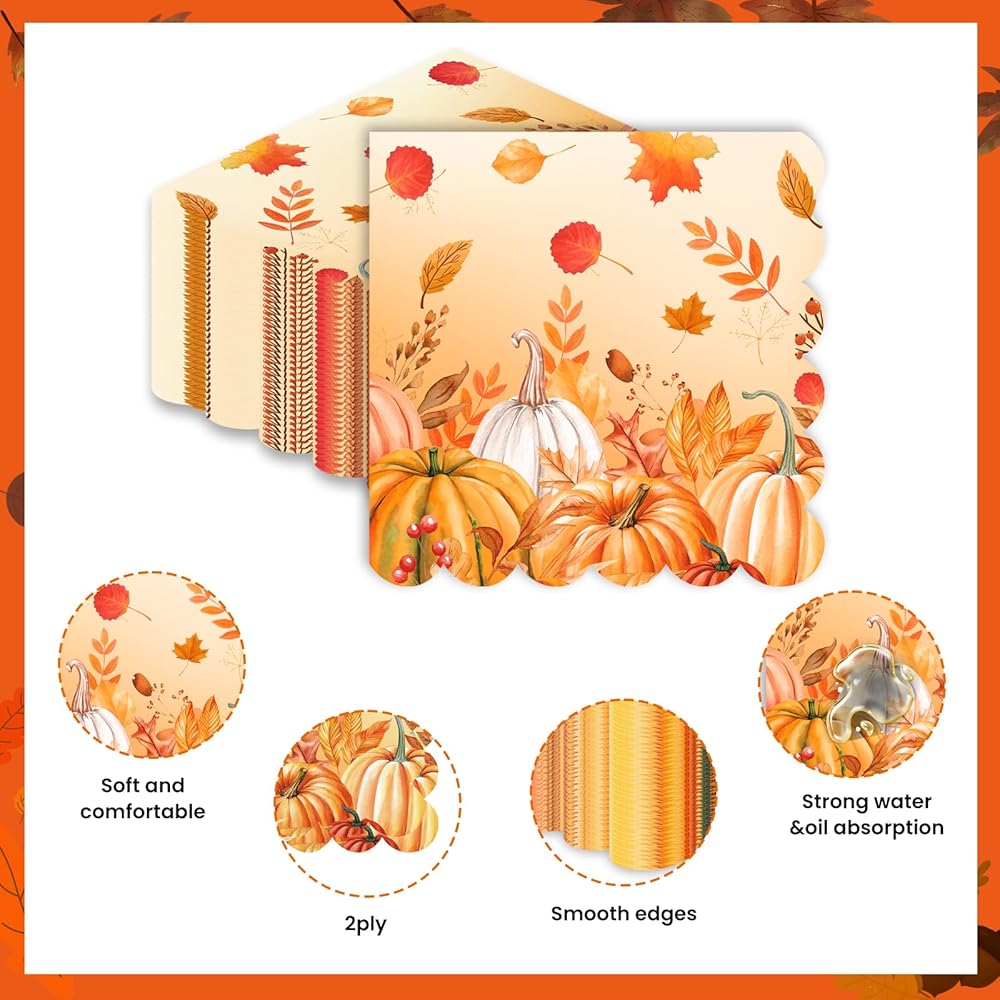 تصميم السقوط الريفي: مناديل الخريف التي يمكن التخلص منها مزين بالقرع بالألوان المائية والزهور وأوراق الخريف ، تضيف مناديل الخريف لمسة من السحر الريفي إلى أي حدث أو احتفال في الخريف.