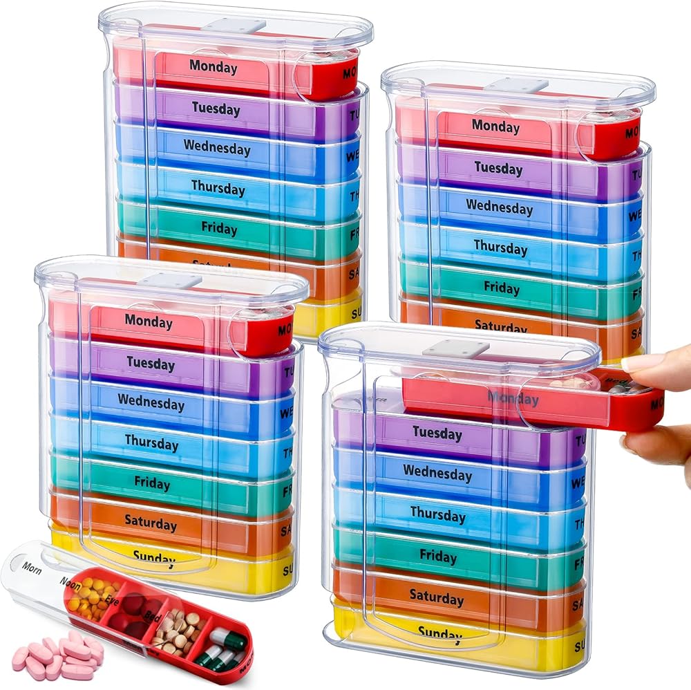 ياومياو 4 قطع منظم حبوب الدواء الأسبوعي 4 مرات في اليوم، علبة حبوب منع الحمل المحمولة منظم الطب الشخصي 1 موزع حبوب مع 7 مقصورات قابلة للتكديس للفيتامينات وزيوت السمك ومكملات الحبوب