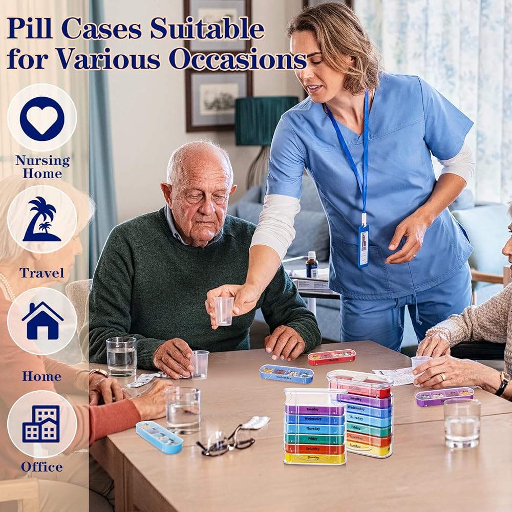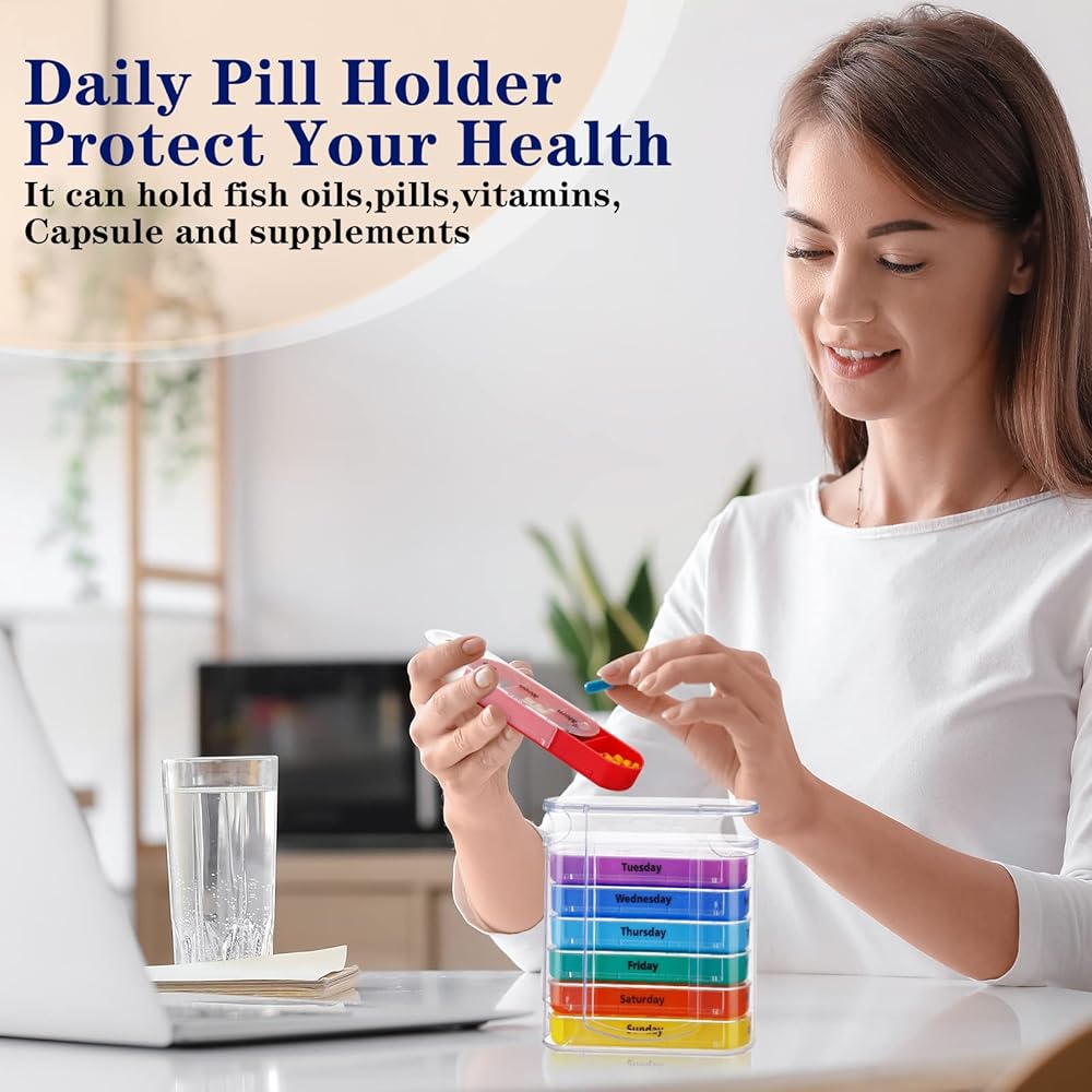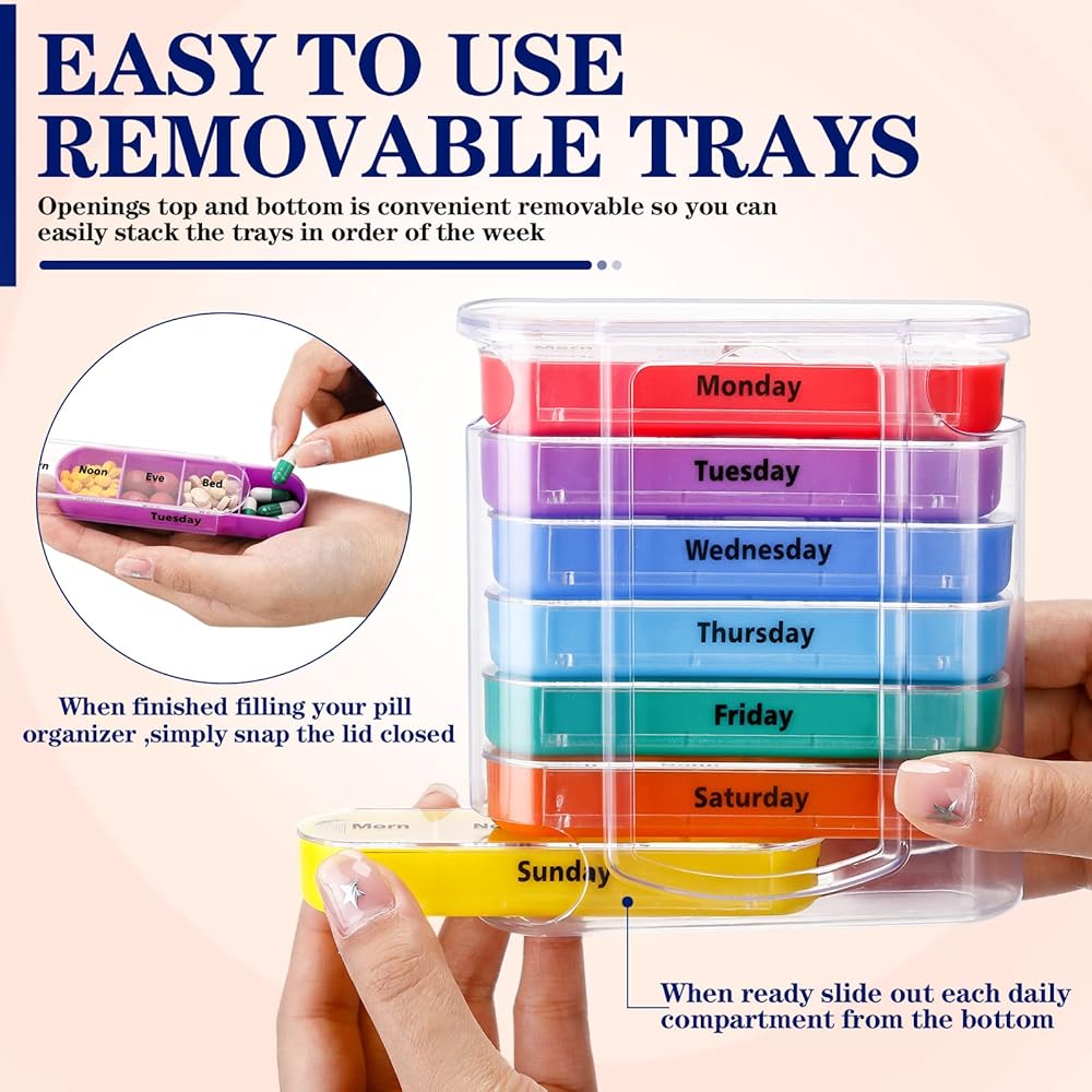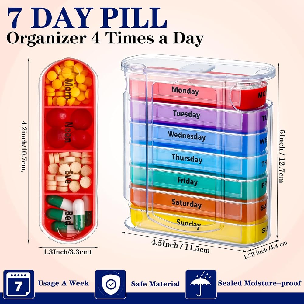• Bright Colors: the medication organizer has transparent case with each tray in different bright color, the days of the week, morning, noon, evening and bed, easily distinguish times to eat different pills and help you to eat pills in time