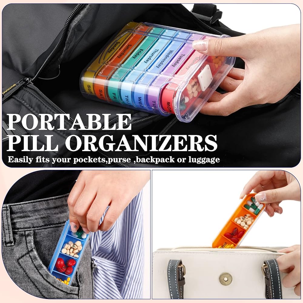 • Portable and Compact: the daily pill organizer is designed with stackable compartments, lightweight and compact, size is portable and suitable without taking up too much space in the bag, backpack, make up bag, pocket, luggage bag, convenient to carry, desirable dispenser for carrying your supplements, fish oils, and pills on short travelling