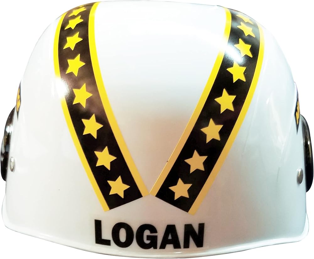 DETAILED with stickers and emblems, movable visor, adjustable chinstrap, and personalized with your choice of text on the lower back of the helmet.