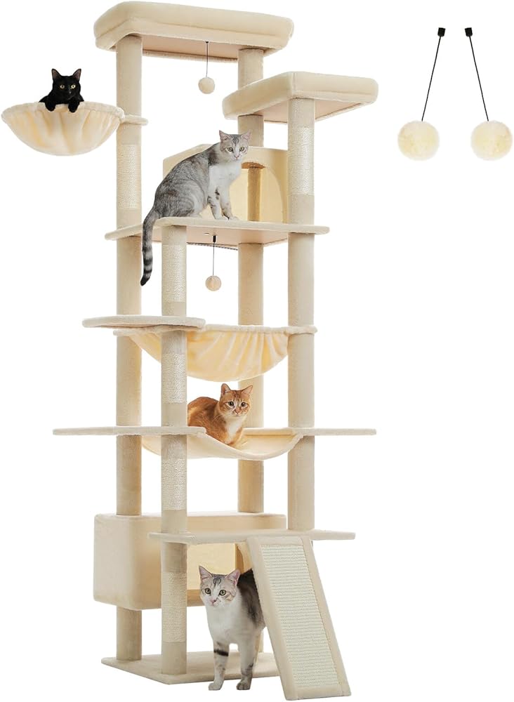 برج القط القوي الثقيل-قاعدة مقواة مع الأشرطة المضادة للنصفة والأرجوحة المعدنية يضمن الاستقرار. مصنوع من لوح خاص مميز وأفخم ناعم - برج القط الطويل الأكثر قويًا للقطط الكبيرة النشطة.