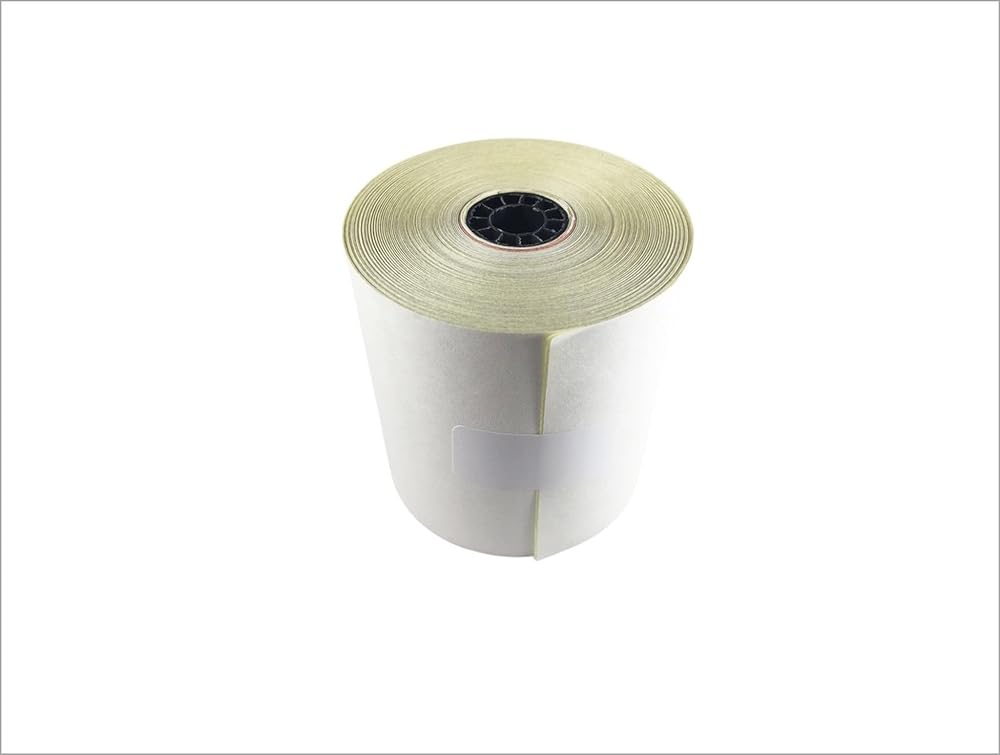 The paper rolls are white with a canary yellow duplicate copy, making it easy to distinguish between the original and duplicate copies of the receipt.