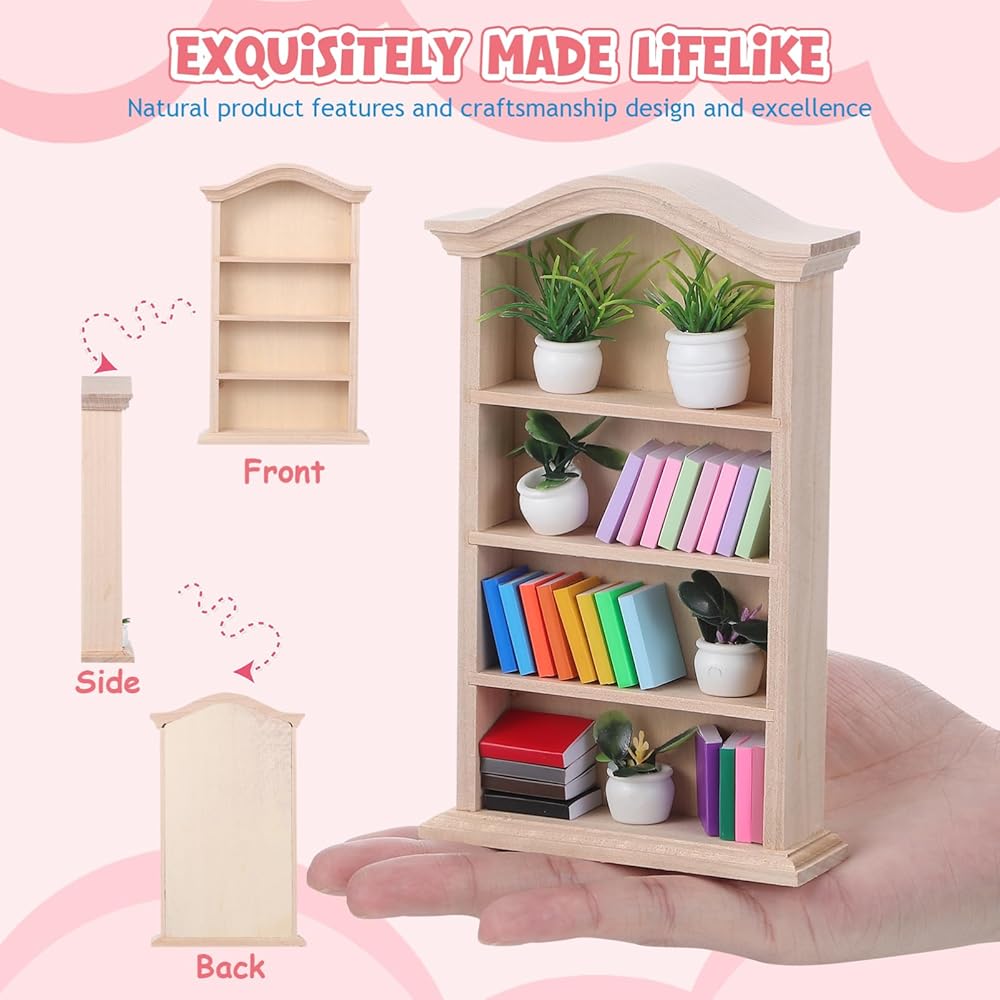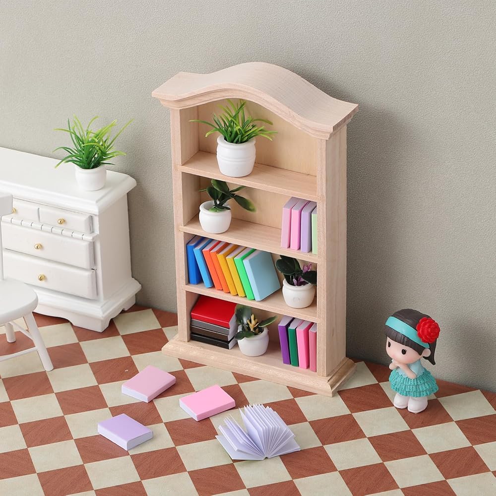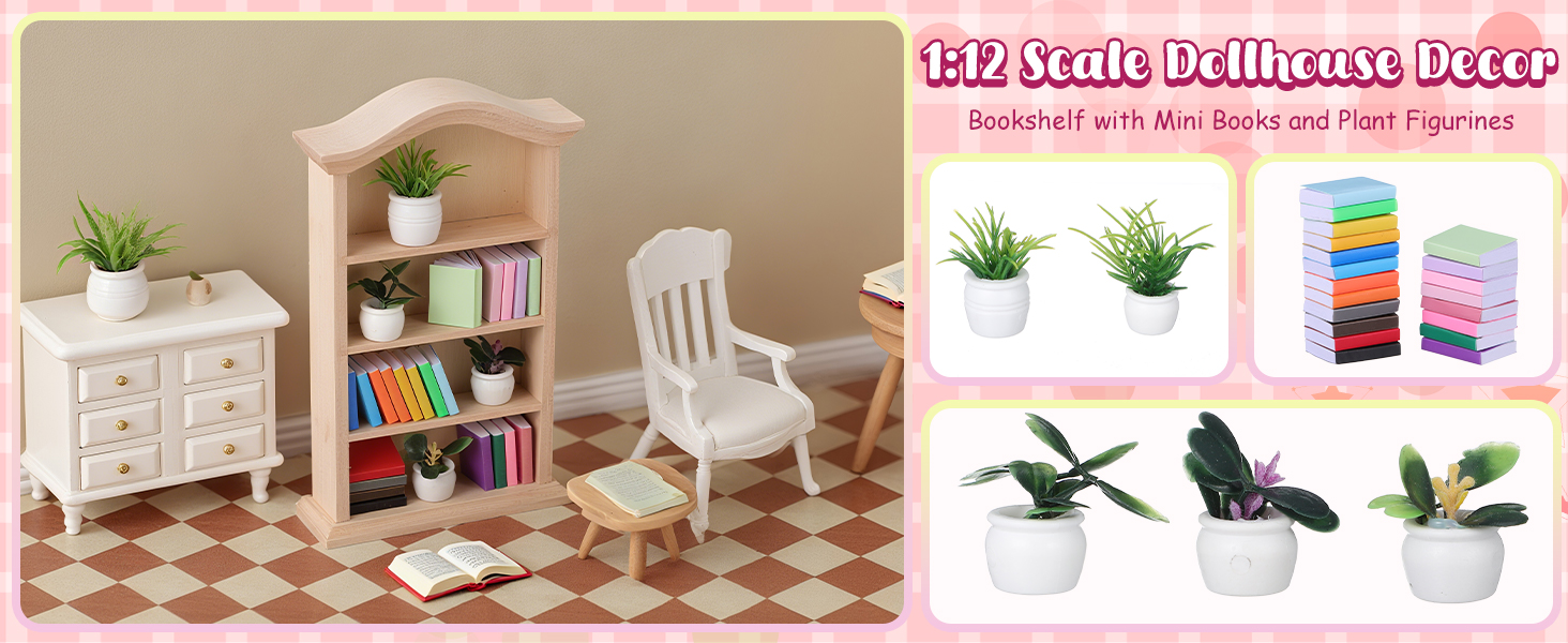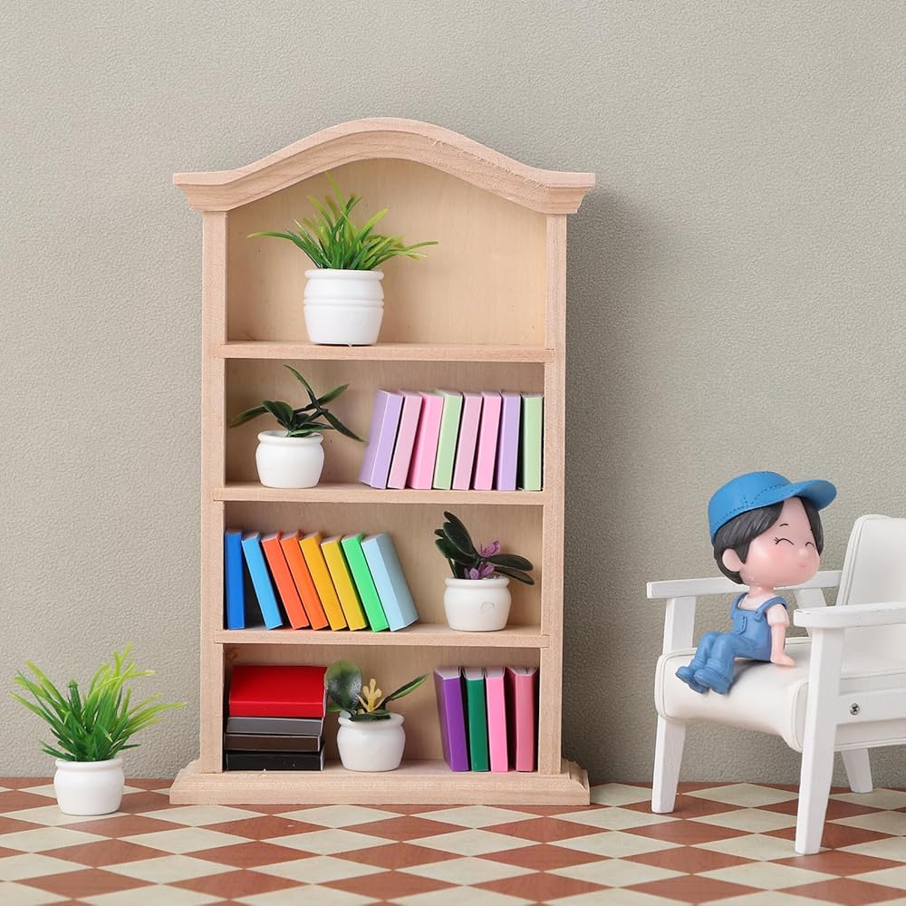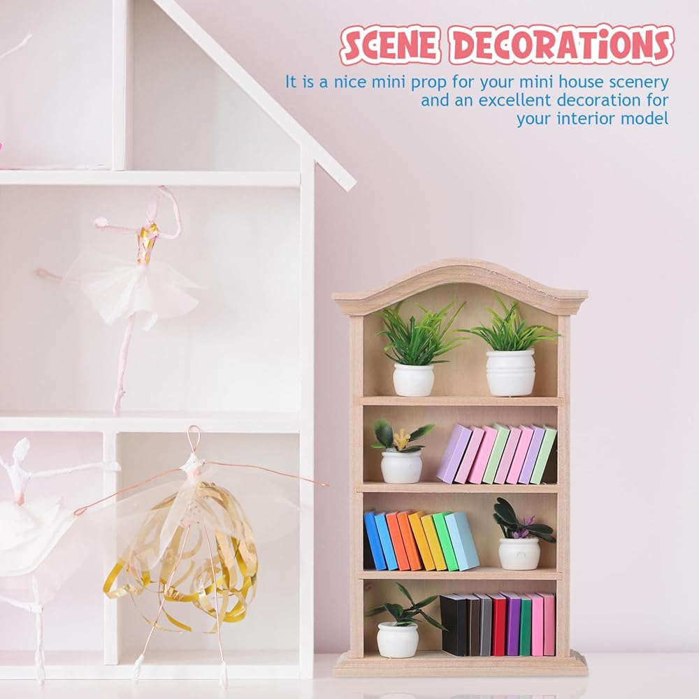 Toyvian Miniature Dollhouse Bookhelf Decor: 1 12 Scale Tiny Bookshelf With Mini Books and Miniatures Plant Fortines - Wooden Book Case Doll House Furniture Accessories