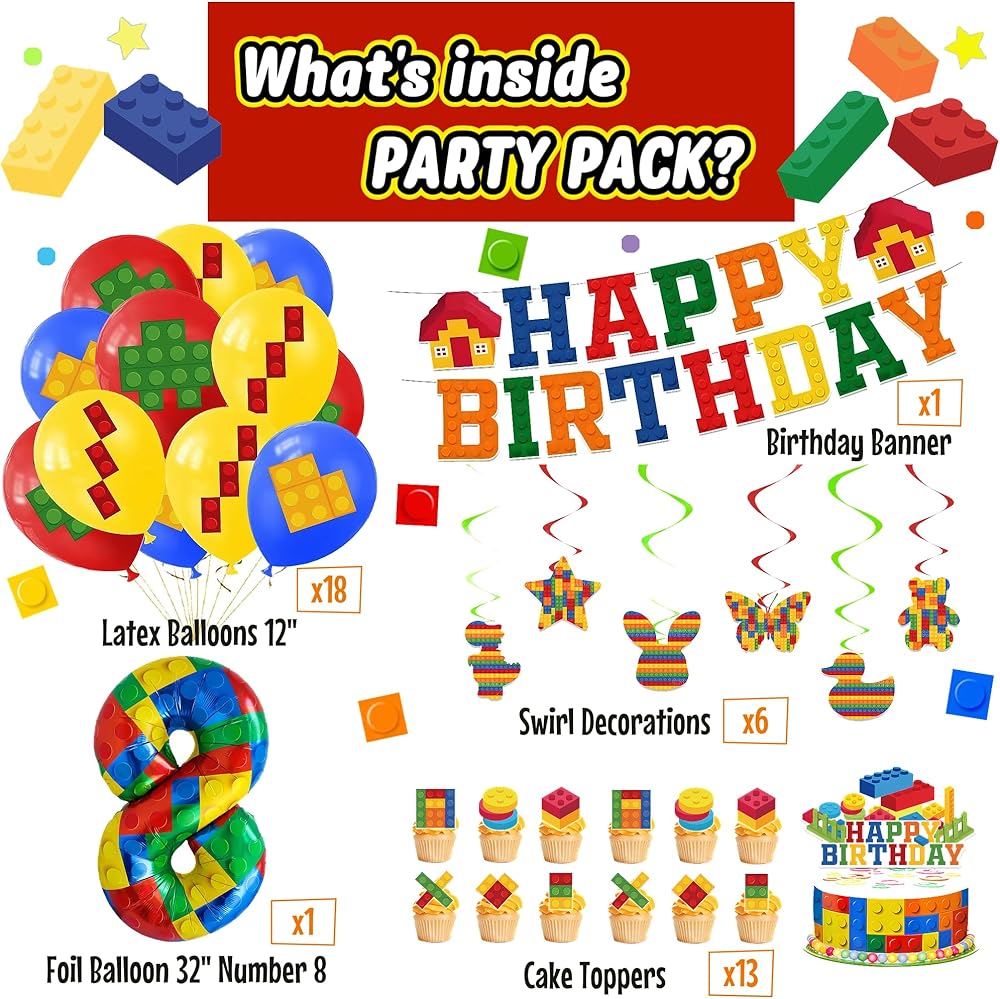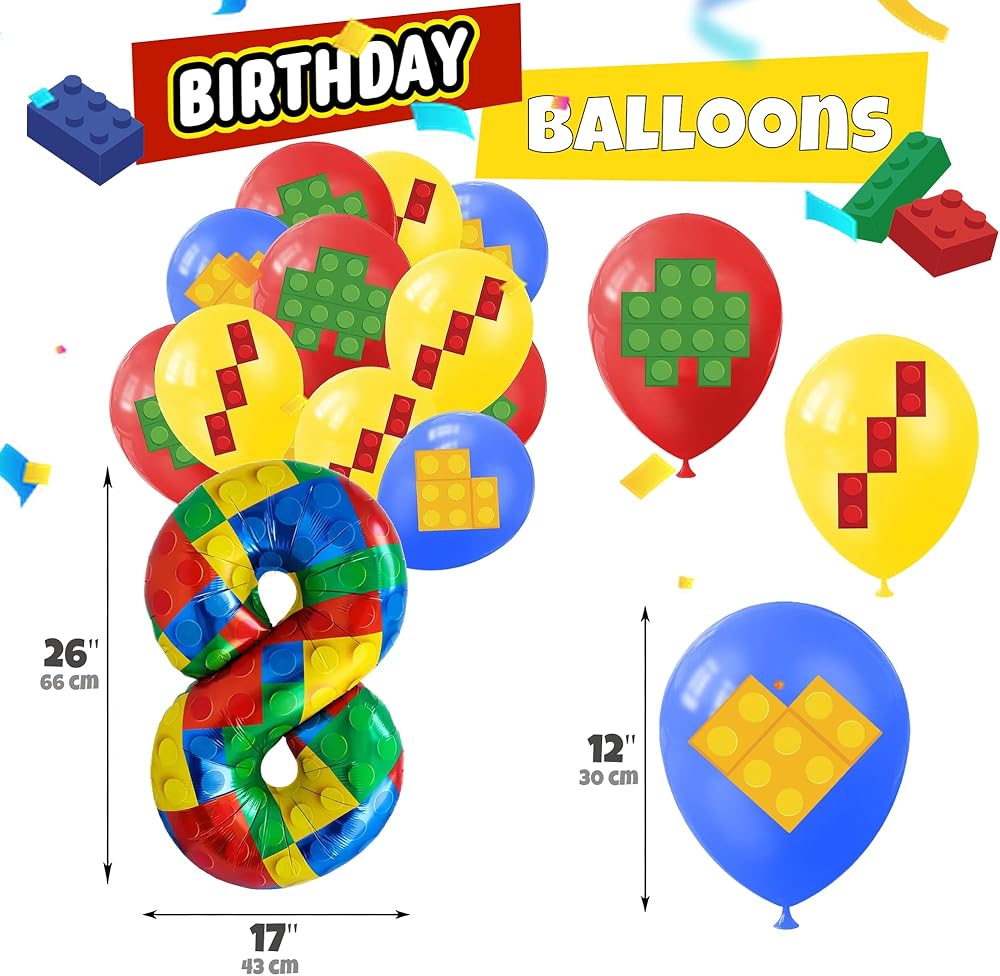 مثالي لعيد ميلاد الأولاد السادس أو التاسع-المصمم خصيصًا للأولاد الذين يبلغون من العمر ستة أو تسعة ، تجعل هذه المجموعة حفلهم متميزًا بألوان زاهية وديكورًا ممتعًا تحت عنوان الطوب.