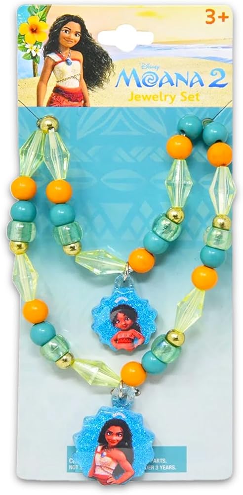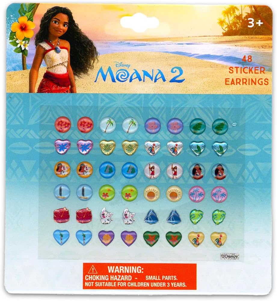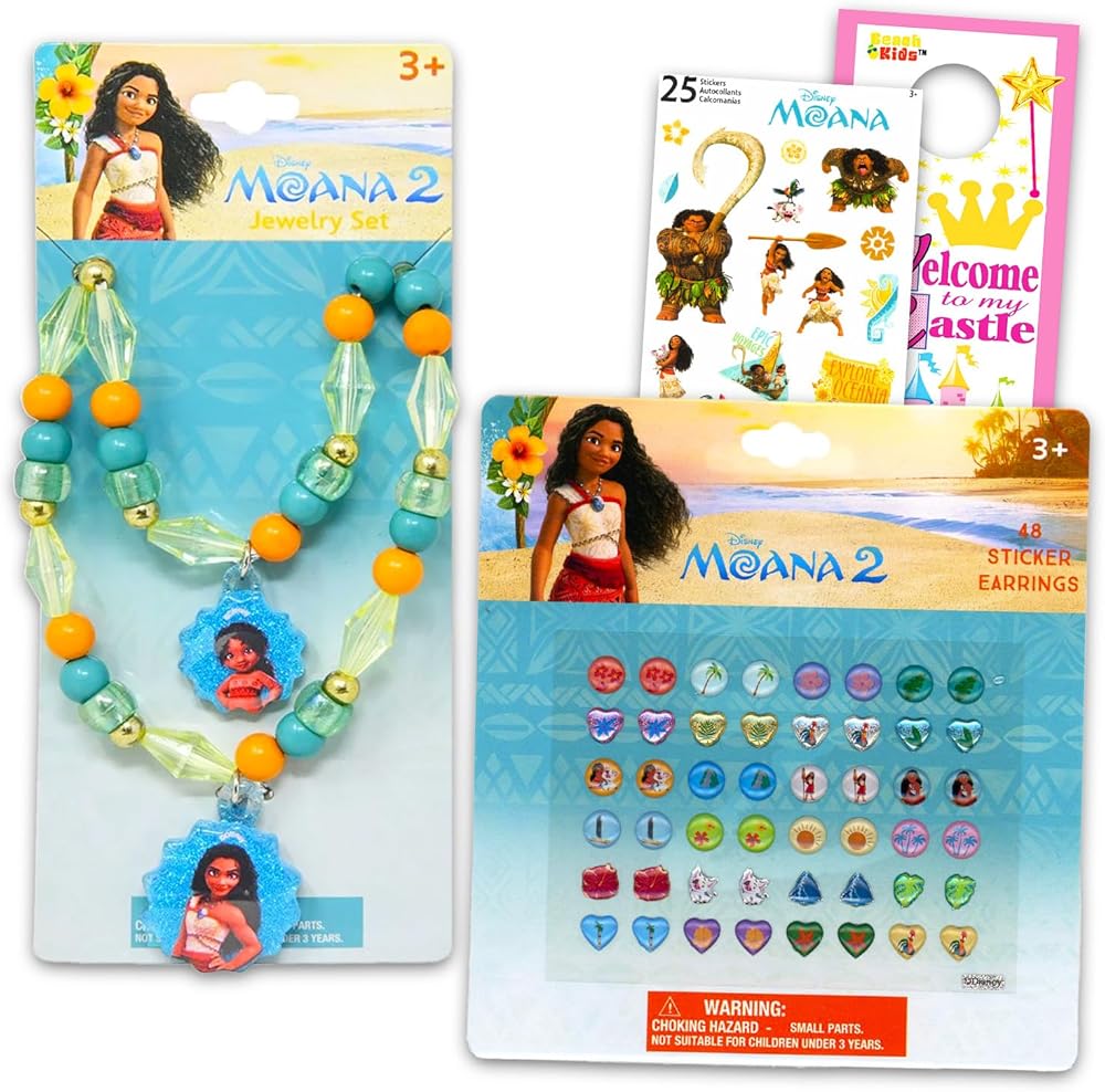 Moana Jewelry Set for Girls - Disney Dress Up Accessories Bundle with Necklace, Sticker Earrings, Bracelet, More | Moana Necklace and Bracelet Set for Kids. This Moana dress up accessories set includes 1 necklace, 1 bracelet, and 24 assorted pairs of sticker earings, all featuring cute Moana themed artwork. Great for all Moana fans, this jewelry set is great to use as party favors, goodie bag fillers, stocking stuffers, part of a gift basket, and more. Sure to be a hit with all Moana fans, these Disney jewelry pieces will make a great addition to any dress up parties and the assorted earrings will allow for endless combinations of fun looks! Officially licensed Disney Moana jewelry for girls also includes Moana stickers and a Beach Kids princess castle door hanger. WARNING: CHOKING HAZARD—Small parts. Not for children under 3 yrs.