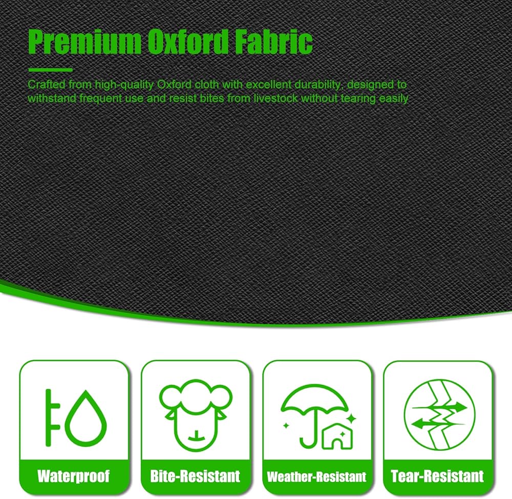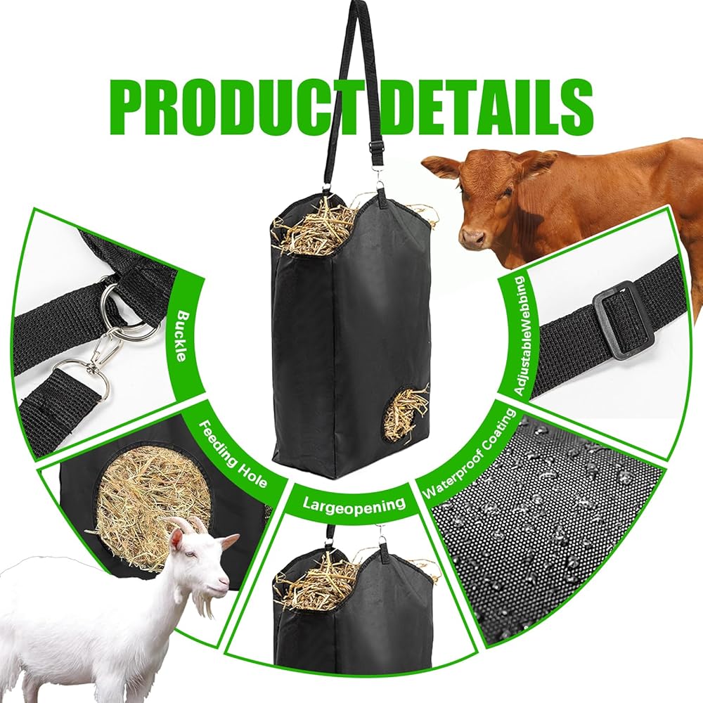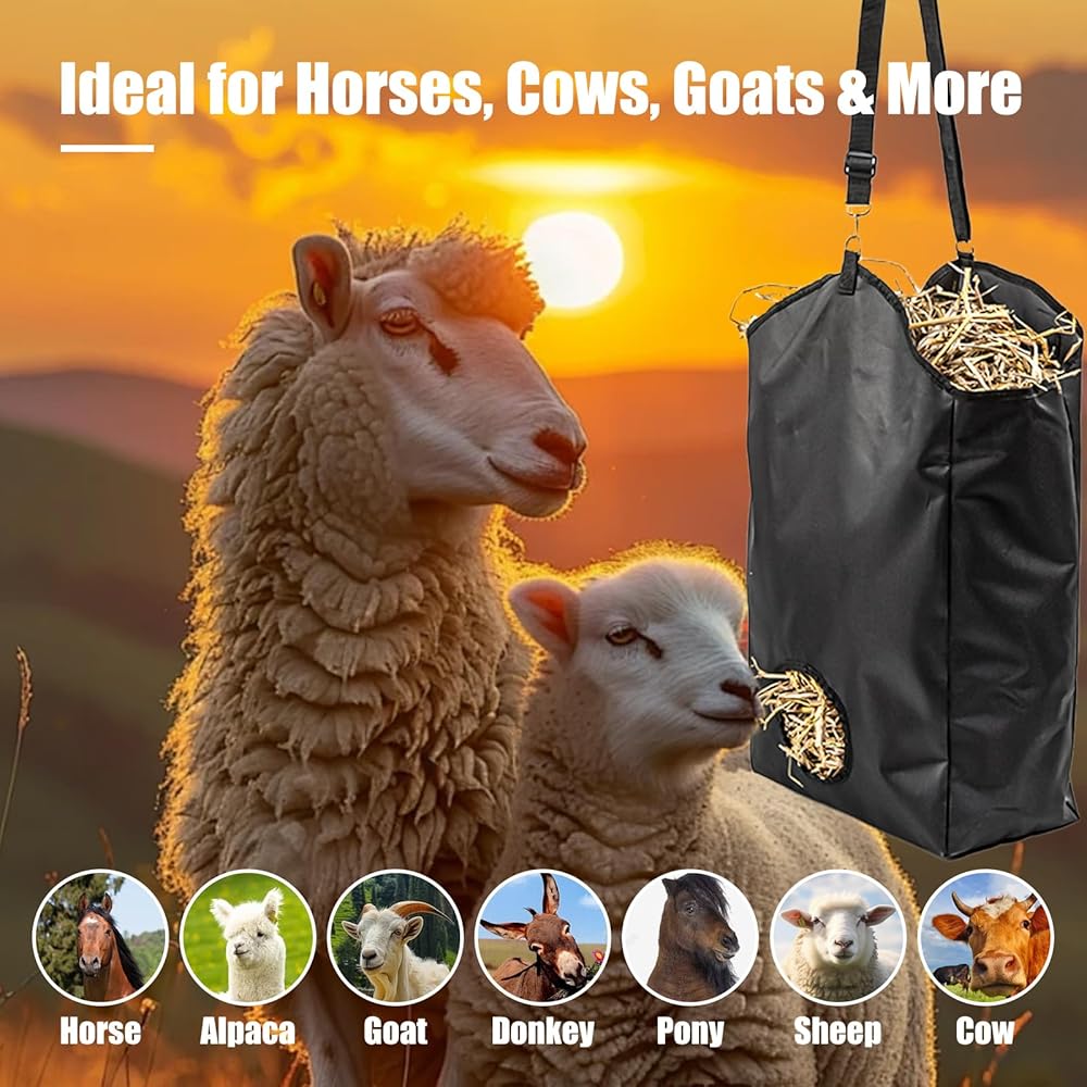 • Durable Premium Oxford Cloth– Crafted from high-quality Oxford cloth with a waterproof coating and reinforced stitching, these hay bags resist tearing, abrasion, and weather damage. Ideal for daily use with horses, goats, rabbits, guinea pigs, donkeys, cows, and other livestock.